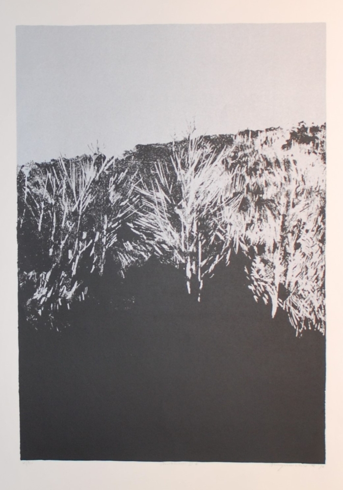 Zeefdruk van Rob Bruyninckx gesigneerd en genummerd op 250 exemplaren. Rob Bruyninckx (1946) is een schilder, tekenaar, beeldhouwer, ontwerper van ruimtelijke structuren en installaties. Werkt vooral met natuurlijk materiaal (ijzer, hout,rubber etc.), een constante in heel zijn oeuvre. Studeerde aan Sint-Lucas te Brussel (1962-1968) en aan het Sint-Lucas-Paviljoen te Antwerpen. Tentoonstellingen.: Barcelona (1977/1978/1979; Dusseldorf 1978; Biennale van Parijs (1980) Biennale Middelheim (1981-1987), Tel Hai ,Israel (1987) Glasgow Garden festival (1988), Belgisch Huis, Keulen 1986, Robert Bruyninkx, Ruimtelijk werk 1987/1988, Gent, Vereniging voor het Museum van Hedendaagse Kunst. Gent.1987. Prijzen: Europaprijs 1976, Prijs van de Schilderkunst Knokke 1977, Prijs van de tekenkunst Jean Miro, Barcelona 1977, Docent tekenen (Brasschaat). Litteratuur: Kunstbeeld in Vlaanderen vandaag, Lannoo, Tielt 1982 Kunst in Belgie na ’45. K. Geirlandt, Antwerpen 1983. Werk in musea te Antwerpen (Middelheim), Museum voor Moderne Kunst (Brussel) Brugge en Israel.