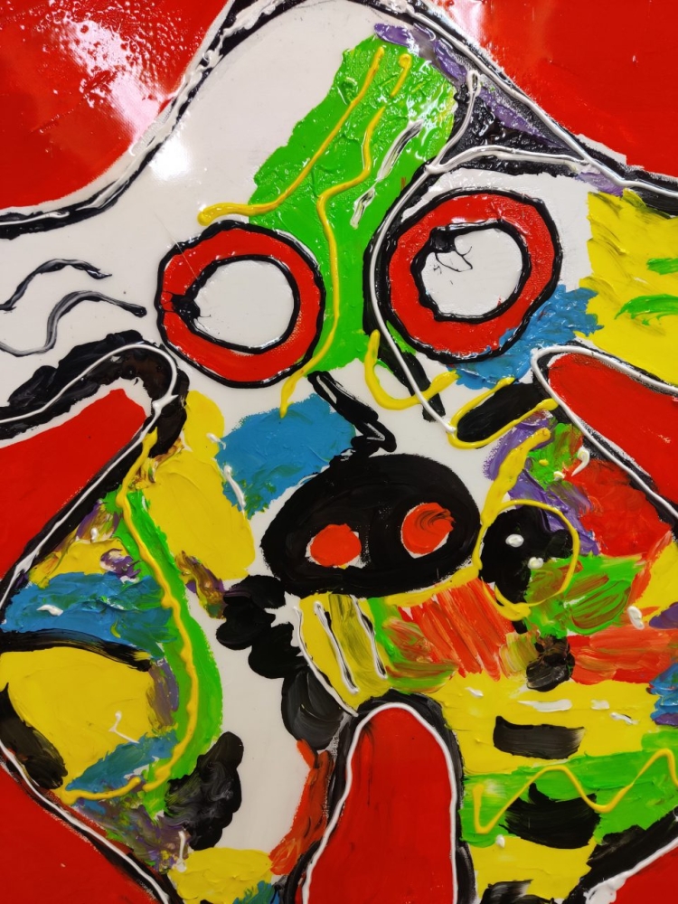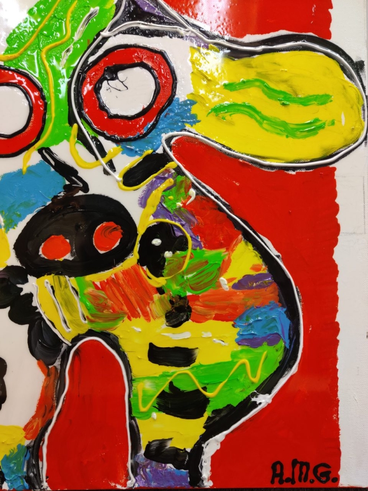 A.M.G. heeft hier een kleurrijke COW gemaakt , met een laag EPOXY , die tegen je aanglimt , het werk zelf is met acrylverf gemaakt , er is vast een mooi plekje voor te vinden , deze maat staat daar garant voor