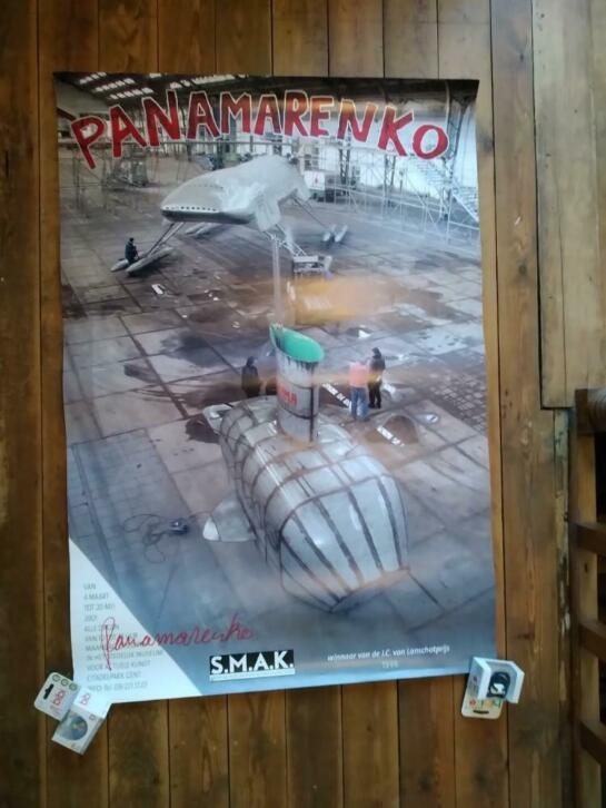 Gesigneerde poster uit 2001. Deze poster werd gebruikt voor een expositie in het stedelijk museum voor actuele kunst te Gent. Op de achtergrond zien we de 'TAHAMA, Spitsbergen, Nova Zemblaya' en de Scotch Gambit. .