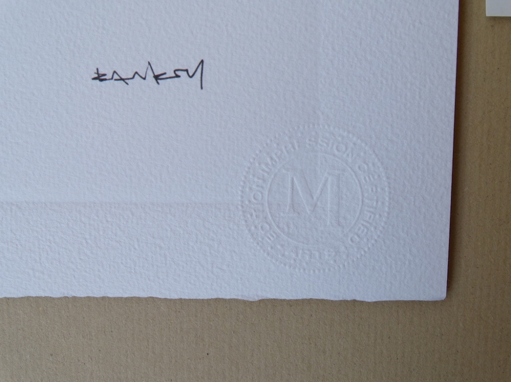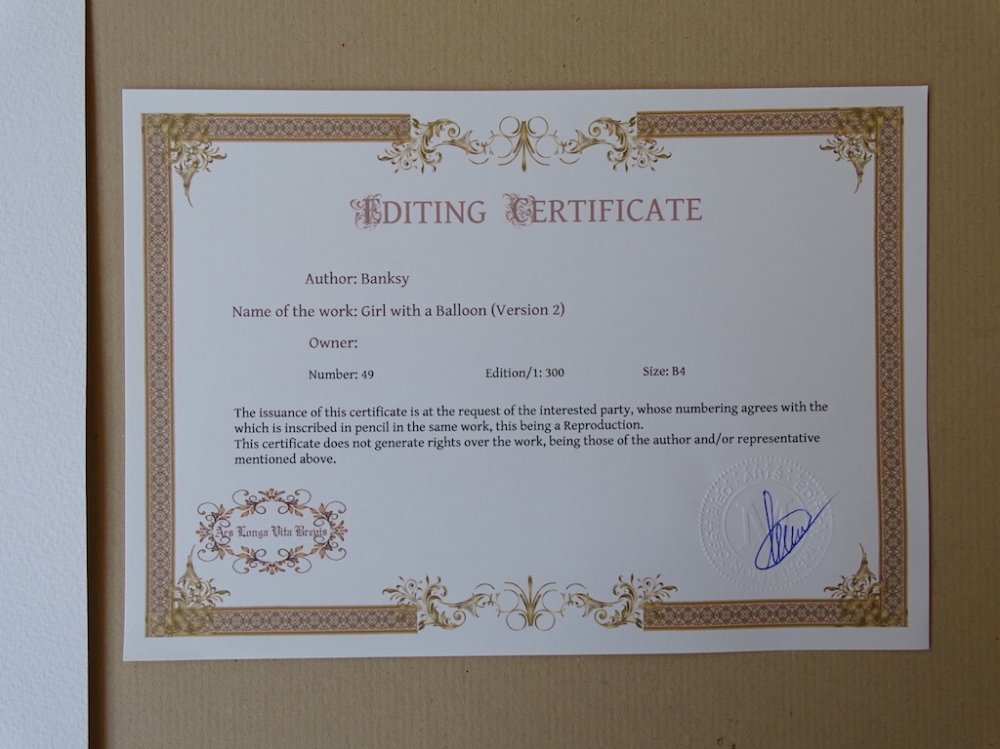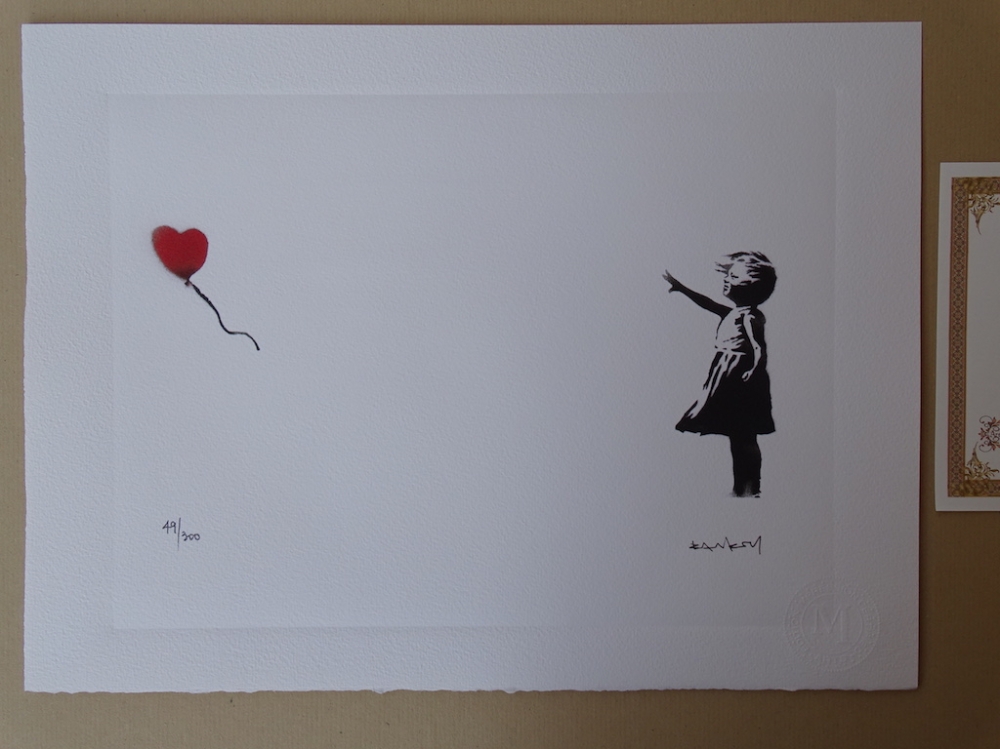 Banksy. Limited edition print reproduction, 38x28cm, Certificate of Authenticity by Certified Arts Edition Impression Ars Longa Vita Brevis Banksy is a pseudonymous England-based street artist, political activist and film director whose real name and identity remain unconfirmed and the subject of speculation. Active since the 1990s, his satirical street art and subversive epigrams combine dark humour with graffiti executed in a distinctive stenciling technique. His works of political and social commentary have appeared on streets, walls and bridges throughout the world. Banksy's work grew out of the Bristol underground scene, which involved collaborations between artists and musicians.Banksy says that he was inspired by 3D, a graffiti artist and founding member of the musical group Massive Attack. Banksy displays his art on publicly visible surfaces such as walls and self-built physical prop pieces. Banksy no longer sells photographs or reproductions of his street graffiti, but his public "installations" are regularly resold, often even by removing the wall they were painted on.Much of his work can be classified as temporary art. A small number of Banksy's works are officially, non-publicly, sold through an agency created by Banksy named Pest Control. Banksy's documentary film Exit Through the Gift Shop (2010) made its debut at the 2010 Sundance Film Festival.In January 2011, he was nominated for the Academy Award for Best Documentary Feature for the film. In 2014, he was awarded Person of the Year at the 2014 Webby Awards.