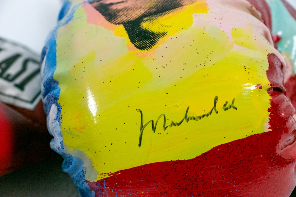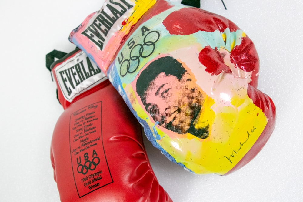 Set of boxing gloves launched on the occasion of Muhammad Ali's Olympic victory in 1960. This set is even more special, as it is uniquely painted by Steve Kaufman and screen printed with Muhammad Ali's likeness. In addition, all personalized gloves are also signed by Steve Kaufman (on the back "SAK") and by Muhammad Ali. This edition was created shortly after 1960, and was limited to 250 regular and 250 deluxe copies. This is a deluxe copy. See also Steve Kaufman's website. The left glove lists the matches and victories of Muhammad Ali, alias Cassius Clay during the 1960 Olympics.