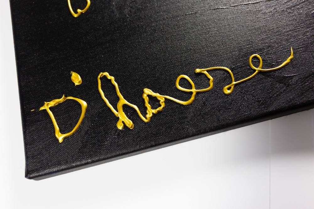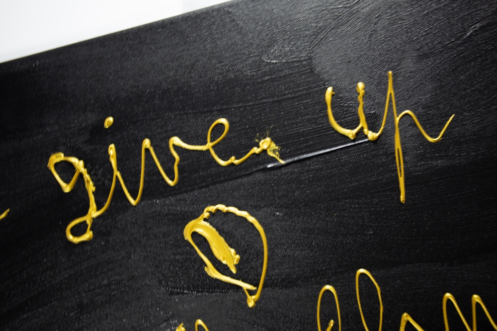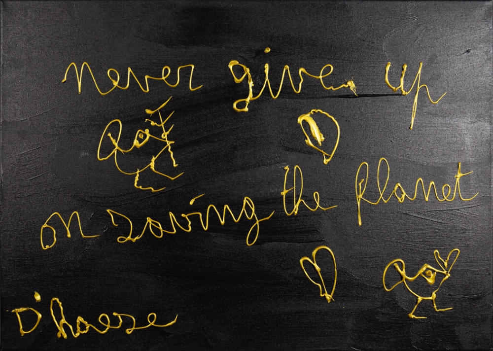 Een uniek schilderij van Hannes D'Haese, met opschrift "Never give up on saving the planet".