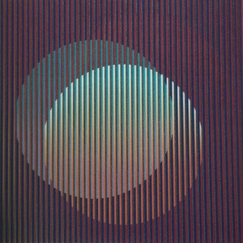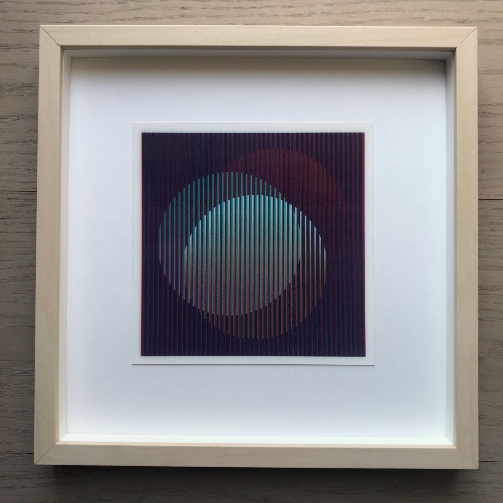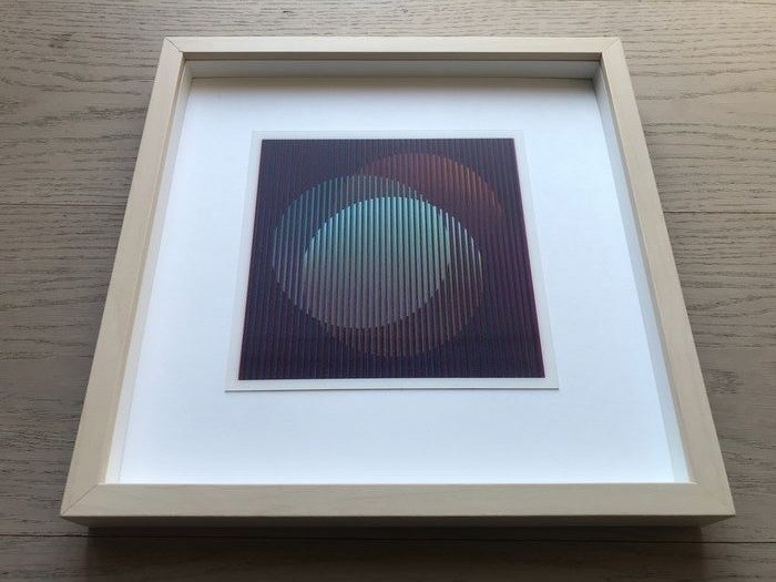 The work is called a Chromointerference Manipulable Mike Galet. It is from 2009. The card is made with a lenticular effect, you can see the effect of the work changing as you look from a different angle. There are 3 different lenticular effects - showing different colored circles combinations. Dimensions work 14cm x 14cm. Dimensions frame 25cm x 25cm x 4cm. These are very hard to find on the market, as it was issued in very limited numbers. The work is in very good condition.