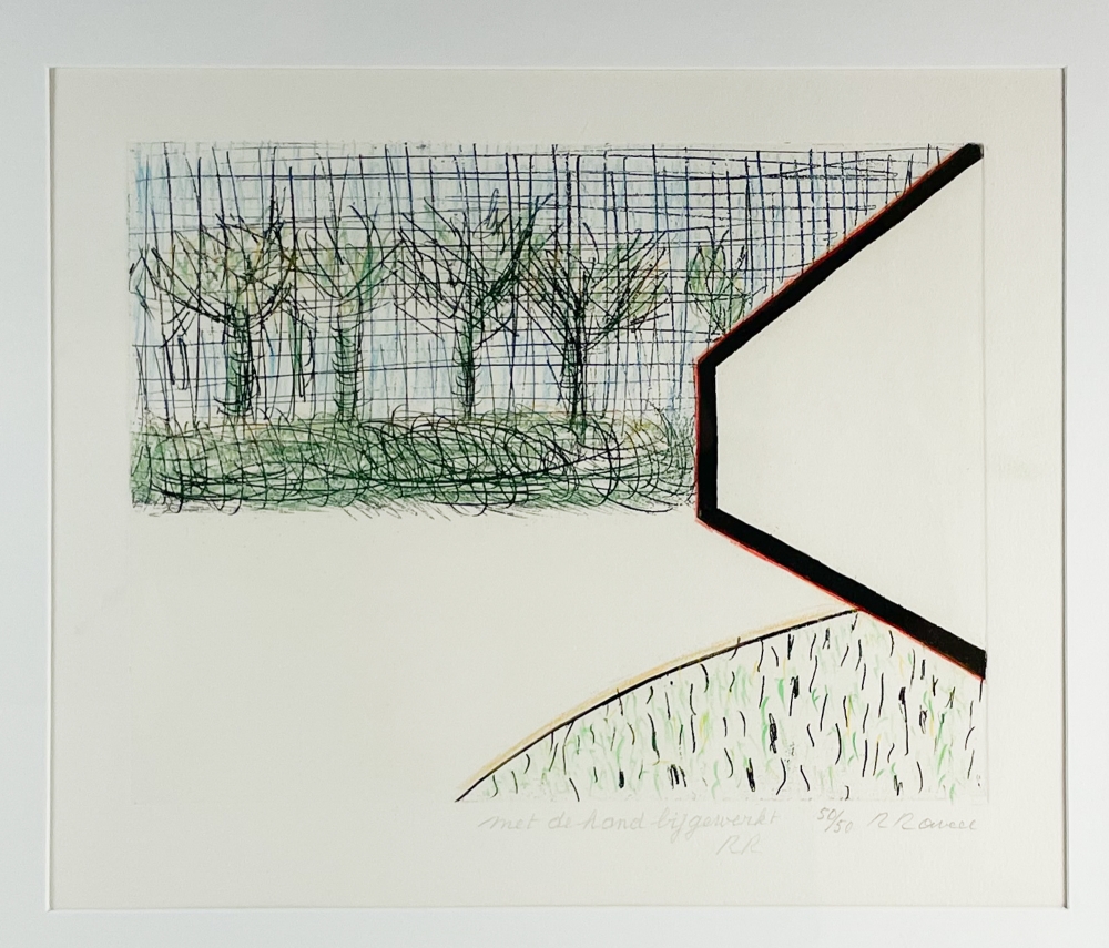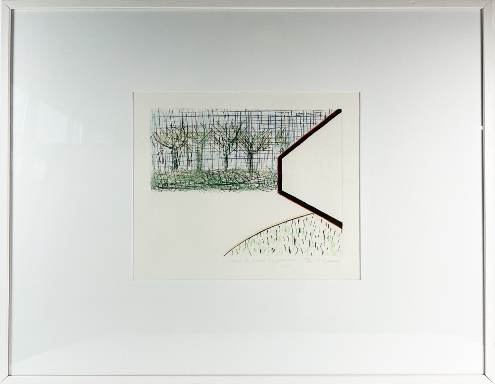 Shaded Atmosphere and Orchard is a black and white etching by Roger Raveel, signed and numbered in 50 copies. Two copies are completely hand-colored, marked 'Hand-touched, RR'. The work and framing are in perfect condition. All color was hand applied by Roger Raveel.
