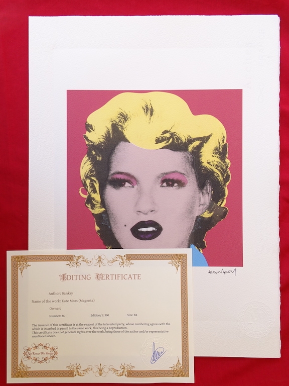 Banksy. Limited edition print reproduction, 38x28cm, Certificate of Authenticity by Certified Arts Edition Impression Ars Longa Vita Brevis Banksy is a pseudonymous England-based street artist, political activist and film director whose real name and identity remain unconfirmed and the subject of speculation. Active since the 1990s, his satirical street art and subversive epigrams combine dark humour with graffiti executed in a distinctive stenciling technique. His works of political and social commentary have appeared on streets, walls and bridges throughout the world. Banksy's work grew out of the Bristol underground scene, which involved collaborations between artists and musicians.Banksy says that he was inspired by 3D, a graffiti artist and founding member of the musical group Massive Attack. Banksy displays his art on publicly visible surfaces such as walls and self-built physical prop pieces. Banksy no longer sells photographs or reproductions of his street graffiti, but his public "installations" are regularly resold, often even by removing the wall they were painted on.Much of his work can be classified as temporary art. A small number of Banksy's works are officially, non-publicly, sold through an agency created by Banksy named Pest Control. Banksy's documentary film Exit Through the Gift Shop (2010) made its debut at the 2010 Sundance Film Festival.In January 2011, he was nominated for the Academy Award for Best Documentary Feature for the film. In 2014, he was awarded Person of the Year at the 2014 Webby Awards.