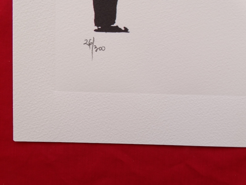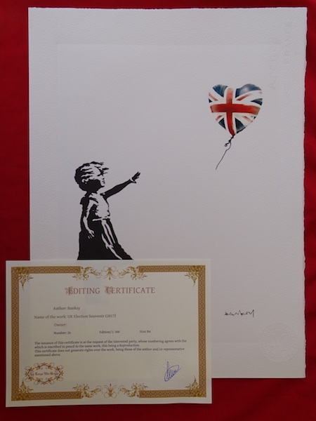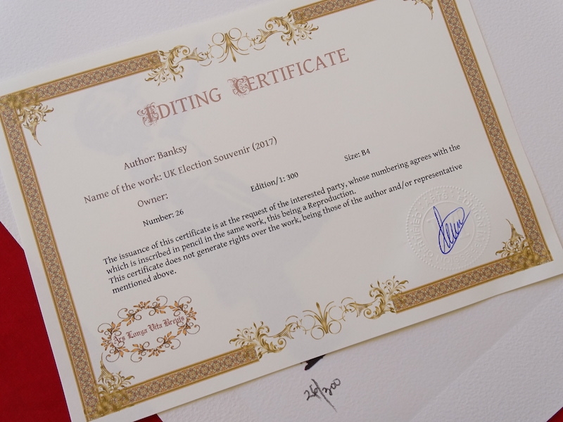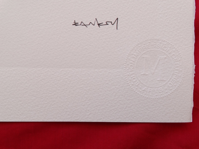 Banksy. Limited edition print reproduction, 38x28cm, Certificate of Authenticity by Certified Arts Edition Impression Ars Longa Vita Brevis Banksy is a pseudonymous England-based street artist, political activist and film director whose real name and identity remain unconfirmed and the subject of speculation. Active since the 1990s, his satirical street art and subversive epigrams combine dark humour with graffiti executed in a distinctive stenciling technique. His works of political and social commentary have appeared on streets, walls and bridges throughout the world. Banksy's work grew out of the Bristol underground scene, which involved collaborations between artists and musicians.Banksy says that he was inspired by 3D, a graffiti artist and founding member of the musical group Massive Attack. Banksy displays his art on publicly visible surfaces such as walls and self-built physical prop pieces. Banksy no longer sells photographs or reproductions of his street graffiti, but his public "installations" are regularly resold, often even by removing the wall they were painted on.Much of his work can be classified as temporary art. A small number of Banksy's works are officially, non-publicly, sold through an agency created by Banksy named Pest Control. Banksy's documentary film Exit Through the Gift Shop (2010) made its debut at the 2010 Sundance Film Festival.In January 2011, he was nominated for the Academy Award for Best Documentary Feature for the film. In 2014, he was awarded Person of the Year at the 2014 Webby Awards.