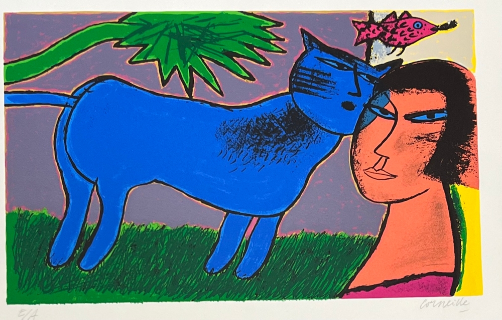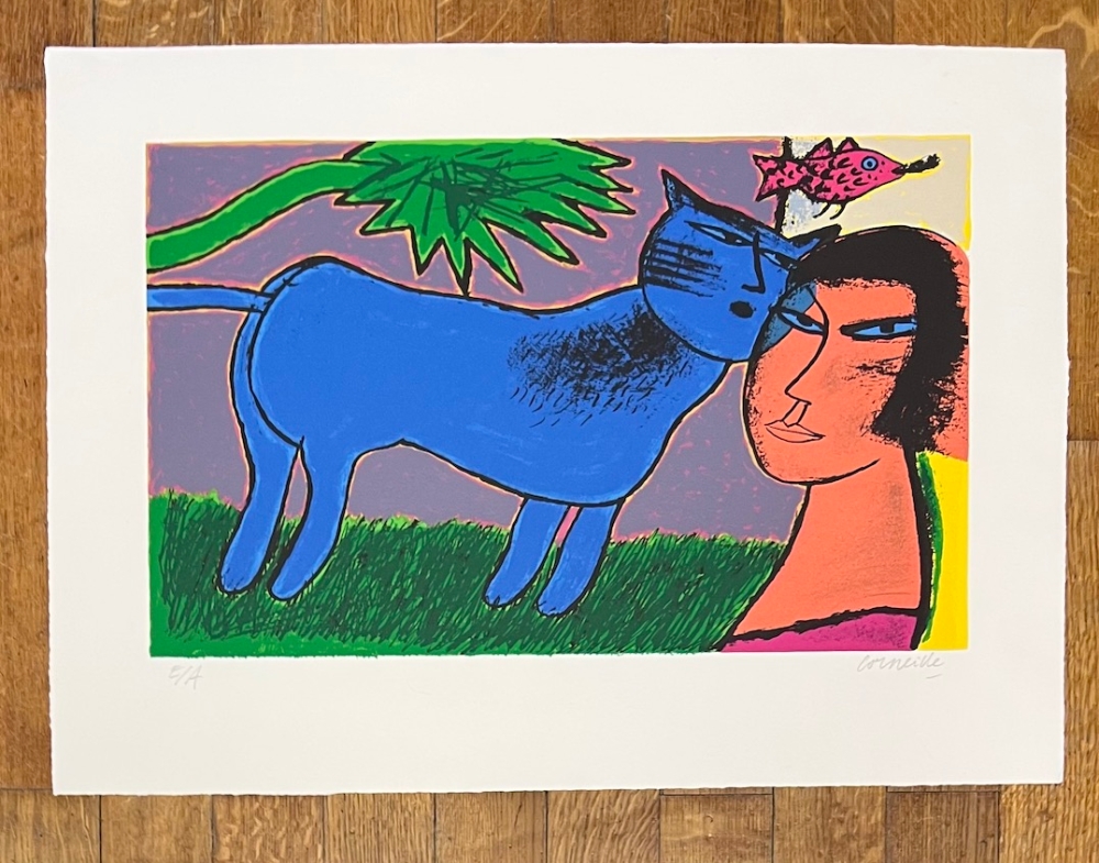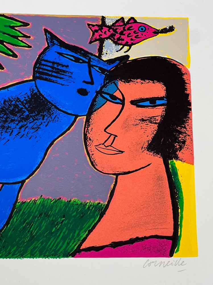 Artist's copy - E/A - Signed in graphite at the bottom. 42 x 58cm Attention: our last copy! Artwork definitely sold out at our gallery next! Corneille retrospective which just ended on January 15th at the Cobra Museum in Amstelveen. Release of a Cobra / Corneille stamp at Bpost in 2023 Corneille jewelry exhibited at the Boghossian Foundation until May 14, 2023 (Ornamentum, Diane Venet Collection) Grand Master of color in the wake of Gauguin and Matisse, Guillaume Corneille creates a jovial world imbued with exoticism. Beautiful lithograph by the painter Guillaume Corneille (1922-2010), born in Liège to Dutch parents, founding member of the Cobra group. 1990s. Atelier Corneille stamp on the back. Perfect condition - Secure shipping with insurance by UPS