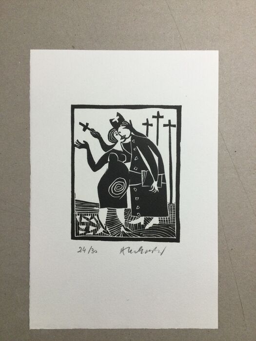 De tekst van 'Le poète assasiné' is het allereerste werk waar Alechinsky illustraties bij tekende. Dit in 1948, tijdens zijn studies in La Cambre (Brussel). In totaal omvat deze uitgave 18 linosnedes van Alechinsky. Dit is er één van (zie ook andere kavels) Elke linosnede is gesigneerd en genummerd in potlood door de kunstenaar. Uitgegeven op slechts 30 exemplaren. Zeldzaam werk. Een uniek en historisch erg belangrijk werk van de nu 95-jarige Pierre Alechinsky. Le poète assassiné est le premier texte quillustra Pierre Alechinsky, avec ces dix-huit linogravures, en 1948, au terme de sa formation à lécole de la Cambre, mais le livre ne fut jamais publié. Ce conte autobiographique, paru pour la première fois en 1916 mais écrit avant la guerre, raconte lhistoire du poète Croniamantal, dabord adulé par tous, puis lynché lors dun mouvement de haine général contre la poésie et les poètes.