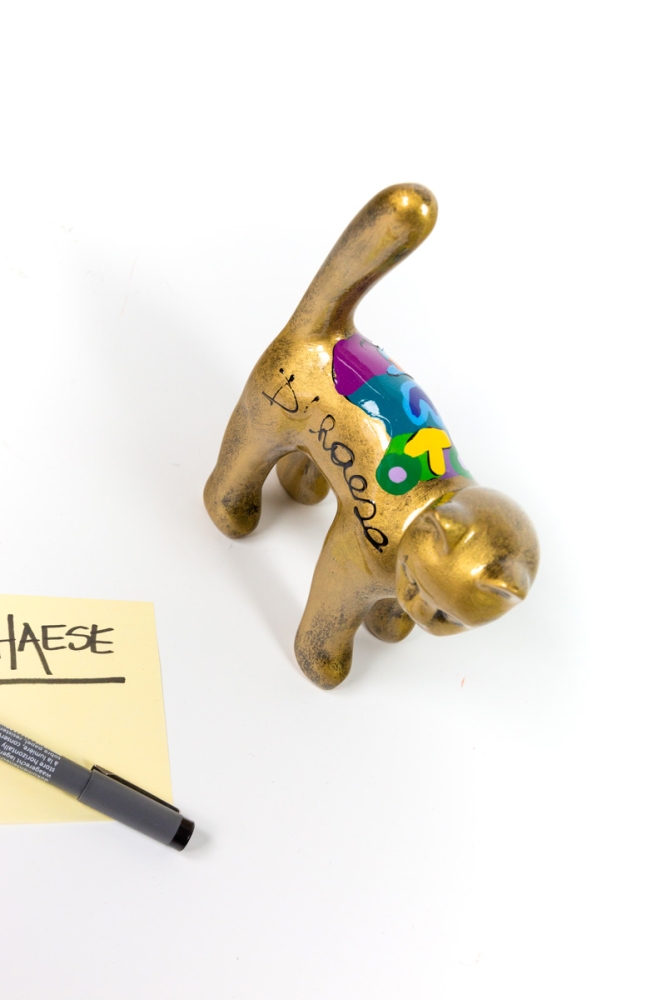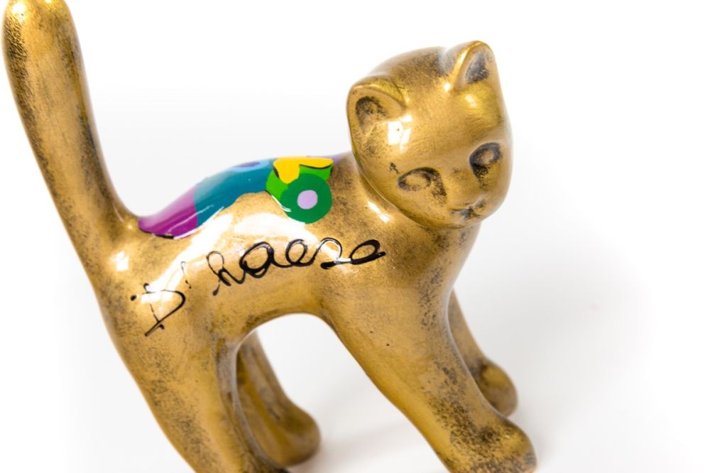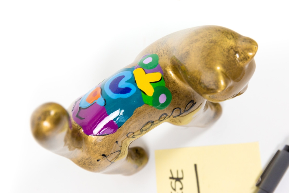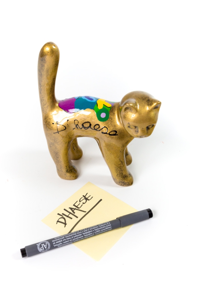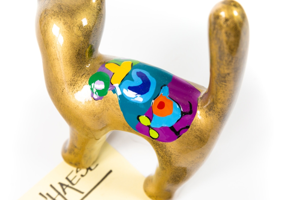 A small sculpture of Hannes D'Haese with a gold colored finish and an original painting on the back.