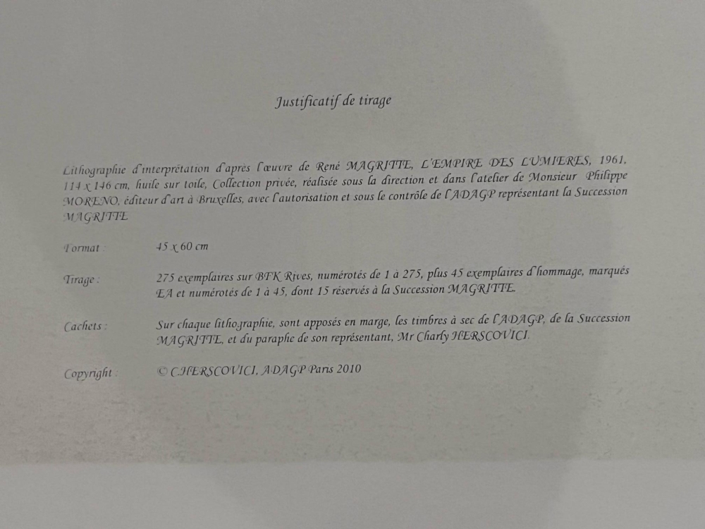 interpretation lithograph after the work of René Magritte private collection, produced under the direction and in the studio of Mr. Phillippe Moreno, art publisher in Brussels, with the authorization and under the control of ADAGP representing the Magritte estate. copyright C. Hersovici, ADAGD Paris 2010