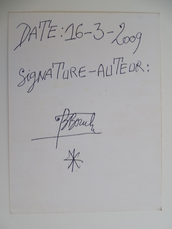 Bouabré was born in Zépréguhé, Ivory Coast, and was among the first Ivorians to be educated by the French colonial government. On 11 March 1948, he received a vision, which directly influenced much of his later works. Bouabré created many of his hundreds of small drawings while working as a clerk in various government offices. These drawings depicted many different subjects, mostly drawn from local folklore; some also described his own visions. All the drawings are part of a larger cycle, titled World Knowledge. Bouabré also created a 448-letter, universal Bété syllabary, which he used to transcribe the oral tradition of his people, the Bétés. His visual language is portrayed on some 1,000 small cards using ballpoint pens and crayons, with symbolic imagery surrounded by text, each carrying a unique divinatory message and comments on life and history. Many of Bouabré's drawings are in The Contemporary African Art Collection (CAAC) of Meshac Gaba. One of his emblematic drawings is saved in the L'appartement 22 collection on the African continent: "Une divine peinture relevée sur le corps d'une mandarine jaunie", made by Bouabré in 1994 in Abidjan.