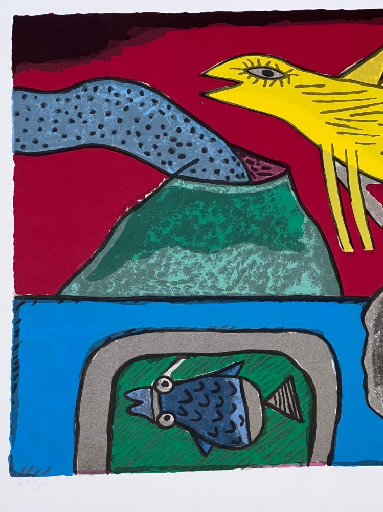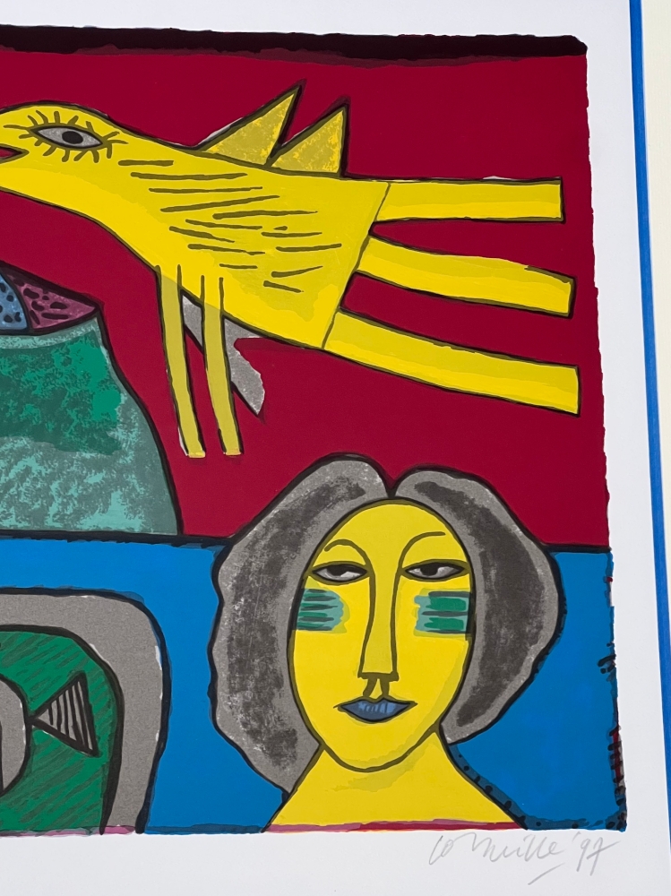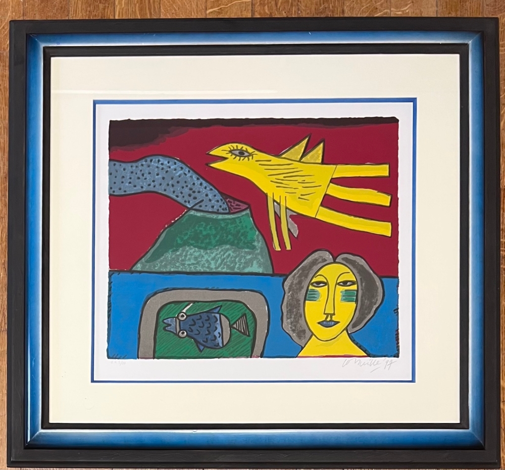 Cobra exhibition with the largest American collection of Cornelius in Miami in spring and summer 2023. Retrospective of Corneille's work at the Cobra Museum in Amstelveen, which ended on 15 January. Release of a Cobra / Cornelius stamp by Bpost in 2023 Corneille's jewellery on display at the Boghossian Foundation until 14 May 2023 (Ornamentum, Collection Diane Venet) Varnished painted wooden frame, made by Corneille during his lifetime. Atelier Corneille stamp on the back. A flamboyant work reproduced in numerous books. In the wake of Gauguin and Matisse, Corneille created a jovial and colourful work which celebrates harmony with nature. Here the four elements are represented. The erupting volcano is a nod to the Italian landscape, the painter having set up his studio for several years in a medieval tower near Macerata. It is also a reference to the Mediterranean, which has regularly inspired her work. Original serigraph by the painter Guillaume Corneille (1922-2010), born in Liège of Dutch parents, founding member of the Cobra movement. Signed and dated in pencil by the artist - Numbered EA 5/20 Total dimensions : 64 x 70 cm - Dimensions of the work : 40 x 44 cm. Very good condition, the frame which is more than 20 years old shows traces of wear and scratches - Secure shipping with insurance by UPS in a cardboard box.