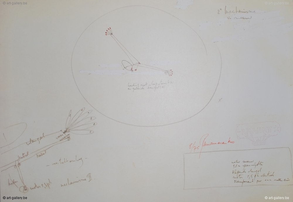Zeefdruk van Panamarenko uit 2003. Gesigneerd en genummerd rechts onderaan. "Dit werk is gewoon amusement. Daar moeten geen dwaze artistieke uitspraken over gedaan worden. Het is amusement, maar aan het eind krijgt het diepte omdat het mij iets zegt, omdat het spreekt. Omdat het iets meer heeft dan speelgoed, omdat het een soort kracht heeft, een energie. En als dat zo is, stel ik het tentoon."