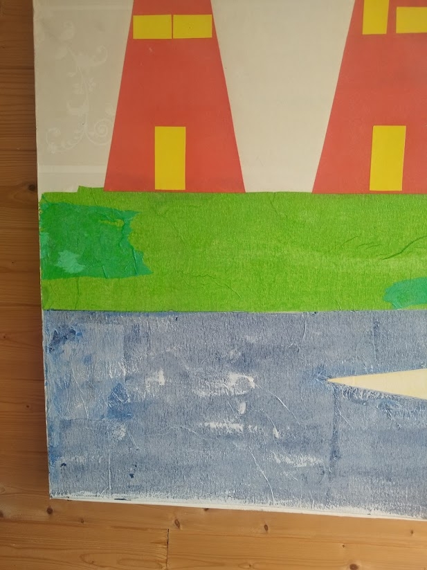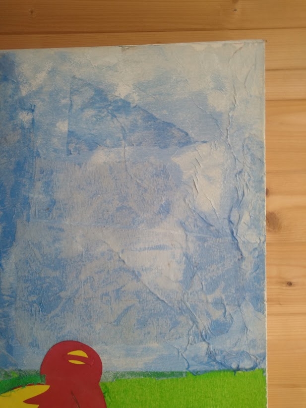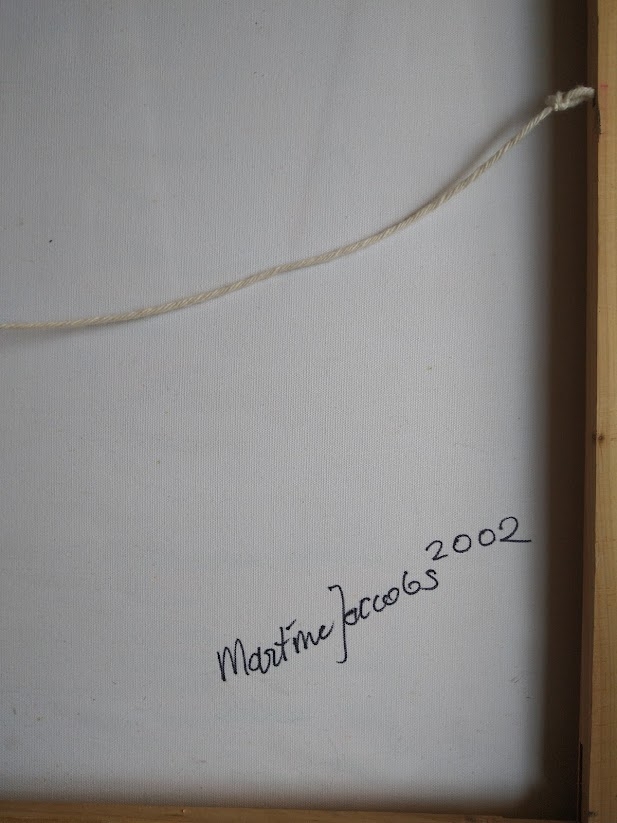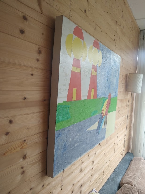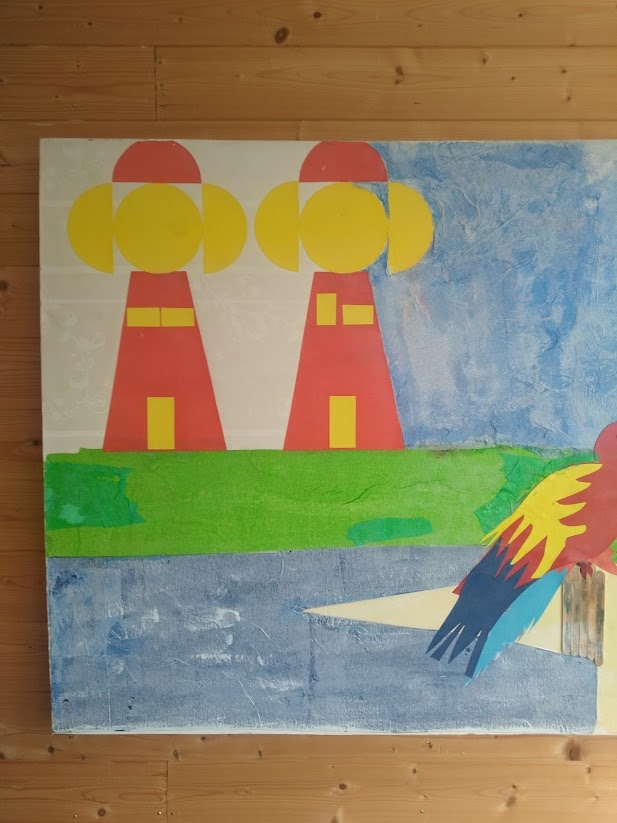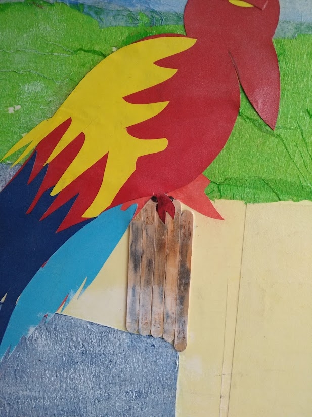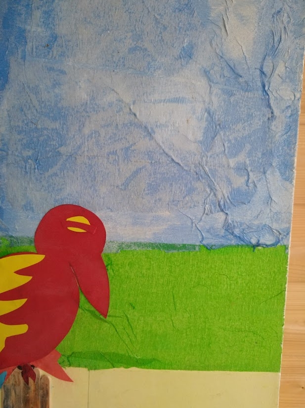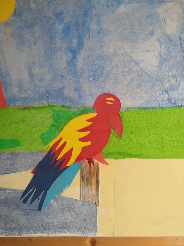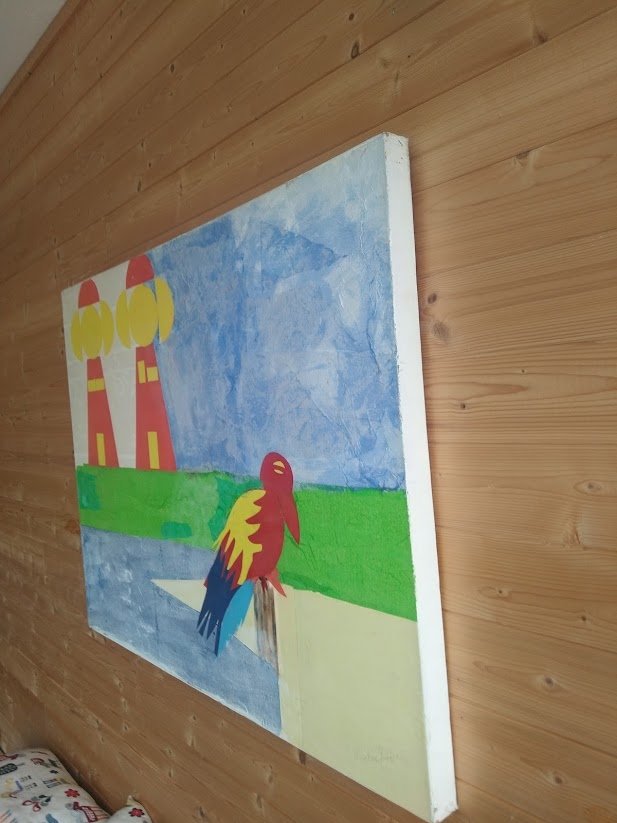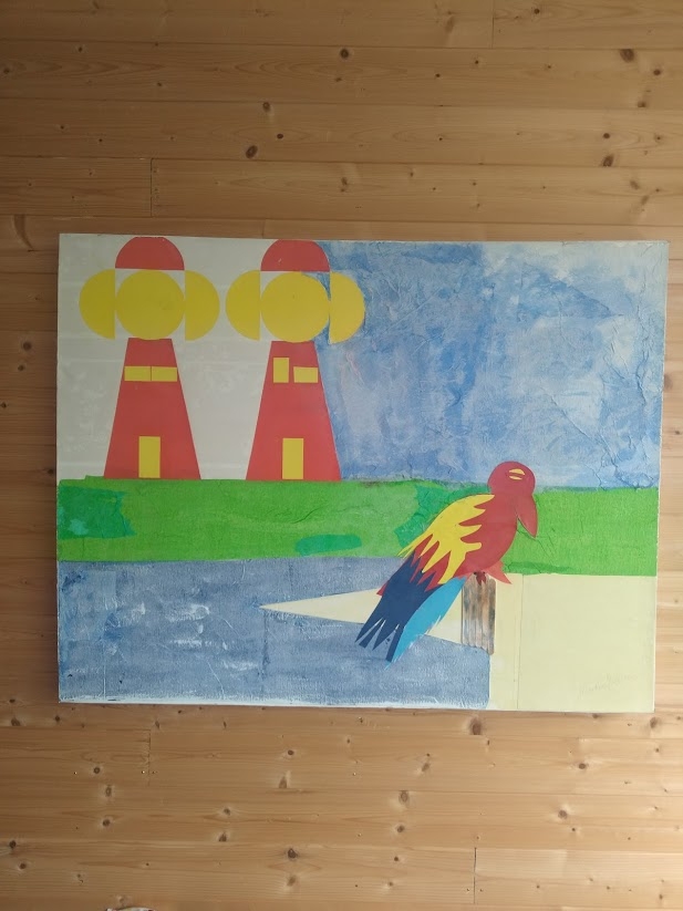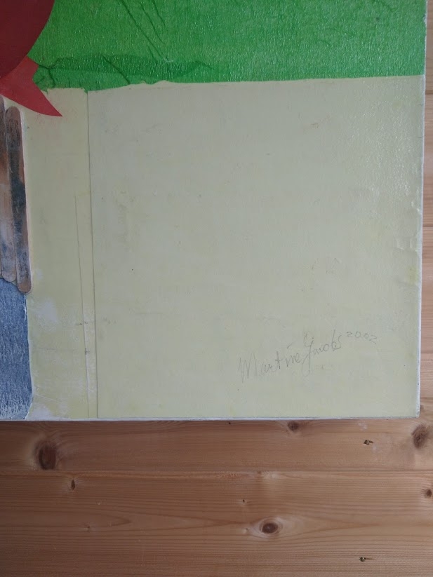 Collage by Martine Jacobs from 2002. Mixed media of paper paint and popsicle sticks. Martin Jacobs Dutch landscape with a tropical bird, of which there are quite a lot in the Netherlands. This work is unique.