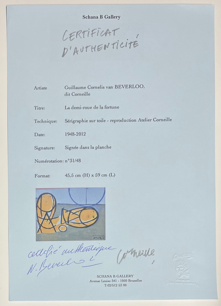 Retrospective of Corneille's work, which ended on 15 January at the Cobra Museum in Amstelveen. Cobra exhibition with the largest American collection of Corneille in Miami in spring and summer 2023. Release of a Cobra / Corneille stamp at Bpost in 2023 Corneille jewellery on display at the Boghossian Foundation until 14 May 2023 (Ornamentum, Diane Venet Collection) Large silkscreen on canvas reproducing an original work of 1948, signed, dated and titled in the plate. Ready to be hung! Edition of only 48 copies celebrating the beginning of the Cobra movement, with the permission of the Fondation Corneille. N° 31/48 Total dimensions : 48 x 62 cm - 2012 - Delivered with a certificate of authenticity - Secure shipping with insurance by UPS Born in Liège to Dutch parents, Guillaume Corneille was one of the founding members of the Cobra group, along with Karel Appel, Constant, Dotremont, Asger Jorn, Joseph Noiret, then Lucebert, Alechinsky...