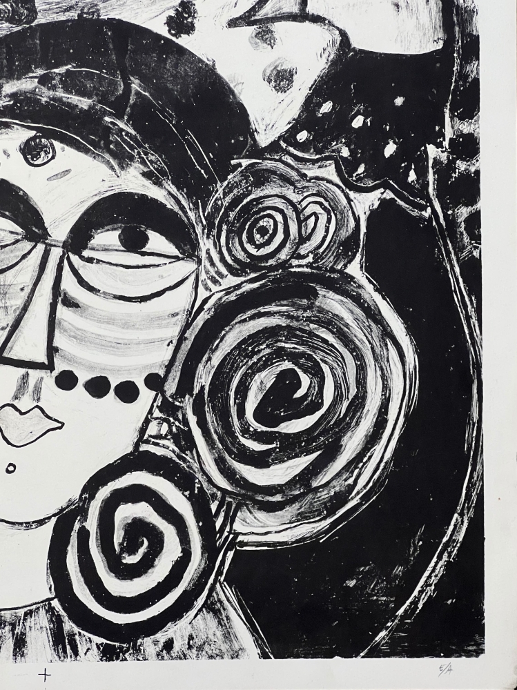 Uncommon work: La belle Georgienne, in b&w, 1978 Cobra exhibition with the largest American collection of Corneille in Miami in spring and summer 2023. Retrospective of Corneille, which has just ended on 15 January at the Cobra Museum in Amstelveen. Release of a Cobra / Corneille stamp by Bpost in 2023 Corneille's jewellery on display at the Boghossian Foundation until 14 May 2023 (Ornamentum, Collection Diane Venet) Beautiful lithograph of the painter Guillaume Corneille (1922-2010), born in Liège of Dutch parents, founding member of the Cobra movement, with Karel Appel, Constant, Asger Jorn, Dotremont, Joseph Noiret or even Lucebert or Alechinsky. Artist's copy E/A (mention in graphite at the bottom right), unsigned, stamped Atelier Corneille on the back - 70 x 54 cm Secure shipping with insurance by UPS