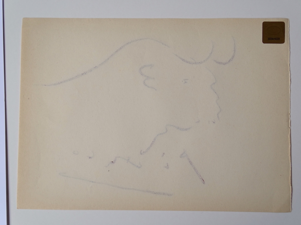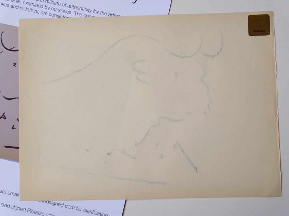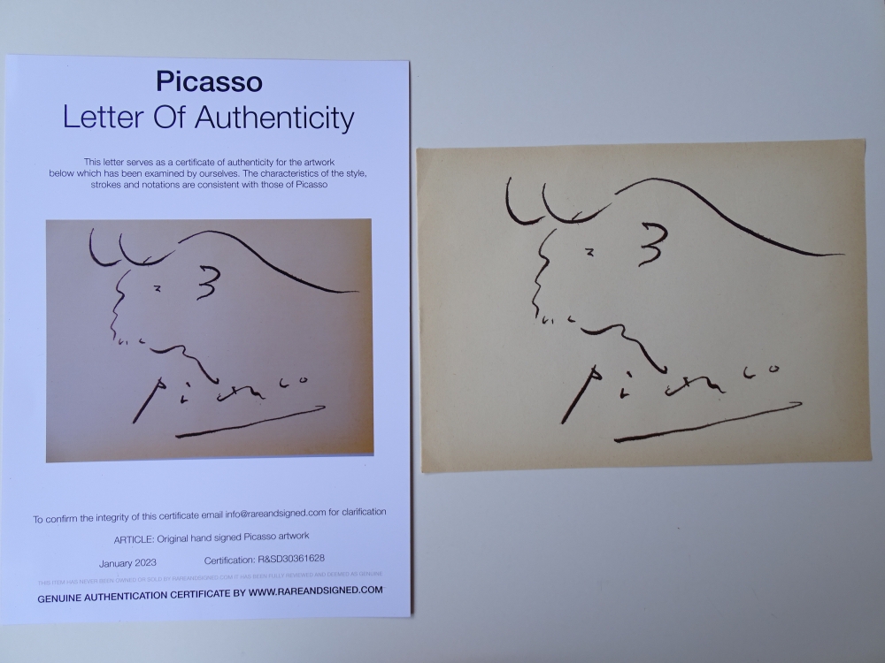 Pablo Picasso (attributed) ink drawing Very good condition Letter of authenticity includedPablo Ruiz Picasso[a][b] (25 October 1881 8 April 1973) was a Spanish painter, sculptor, printmaker, ceramicist and theatre designer who spent most of his adult life in France. Regarded as one of the most influential artists of the 20th century, he is known for co-founding the Cubist movement, the invention of constructed sculpture, the co-invention of collage, and for the wide variety of styles that he helped develop and explore. Among his most famous works are the proto-Cubist Les Demoiselles d'Avignon (1907), and the anti-war painting Guernica (1937), a dramatic portrayal of the bombing of Guernica by German and Italian air forces during the Spanish Civil War.