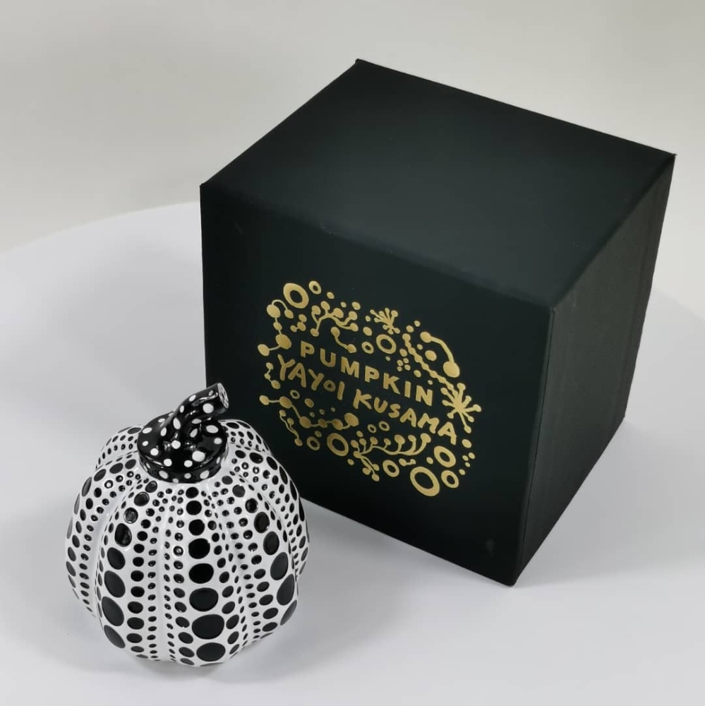 Yayoi Kusama is a famous Japanese artist. Among his most famous works are his Polka Dot Pumpkins. Artist: Yayoi Kusama (after) Title: Pumpkin (black & white) Box original Dimension : 8x8x10cm Resin