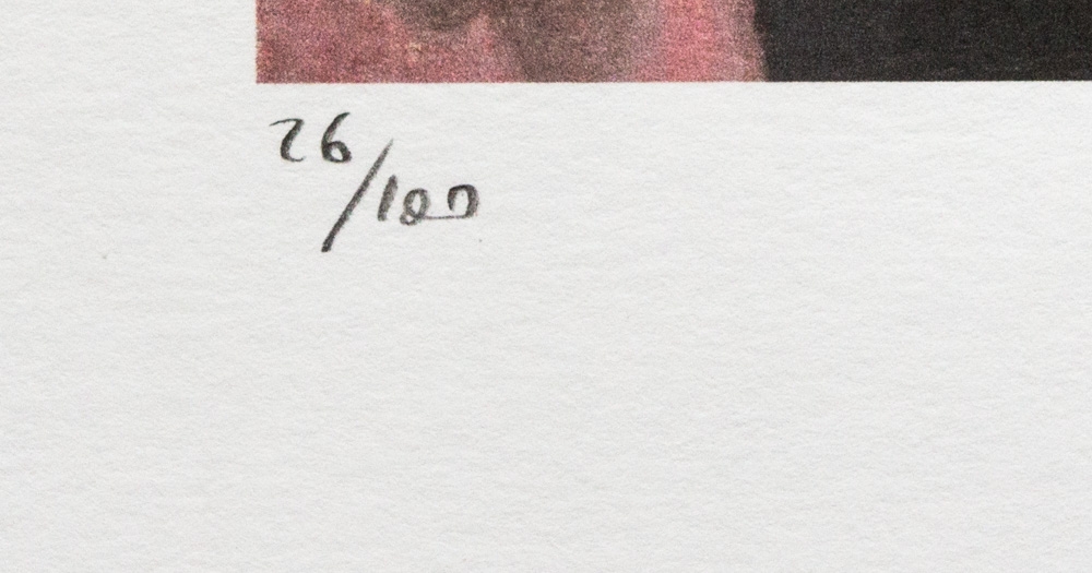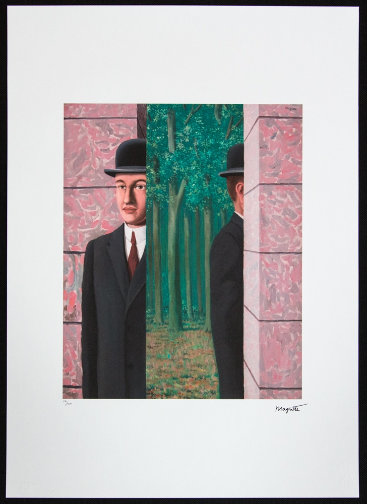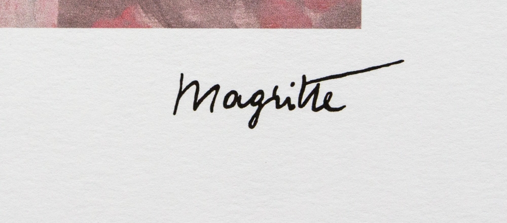 Rene Magritte (after) "The Commonplace" offset lithography, limited edition of 100, plate signed bottom right, numbered with pencil bottom left 26/100, bottom left publishing house stamp "SPADEM, Paris", fine art paper, sheet size: 50 x 70cm, without additional documentation, sold unframed; we offer in-house shipping, if the buyer win multiple items, we will combine shipping