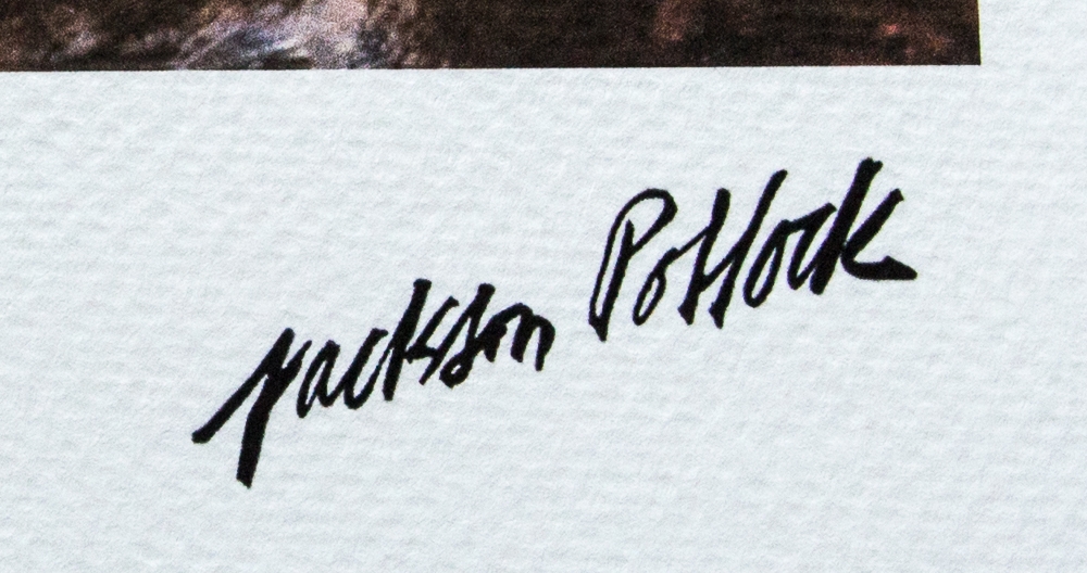 Jackson Pollock (after) "The Flame" offset lithography, sheet size 50 x 70 cm, plate signed bottom right, numbered with pencil bottom left, limited edition 180/300, with embossing stamp "SPADEM, Paris" and "ArtiGraficheRoma", heavy cotton paper, without additional documentation, sold unframed; we offer in-house shipping, if the buyer win multiple items, we will combine shipping