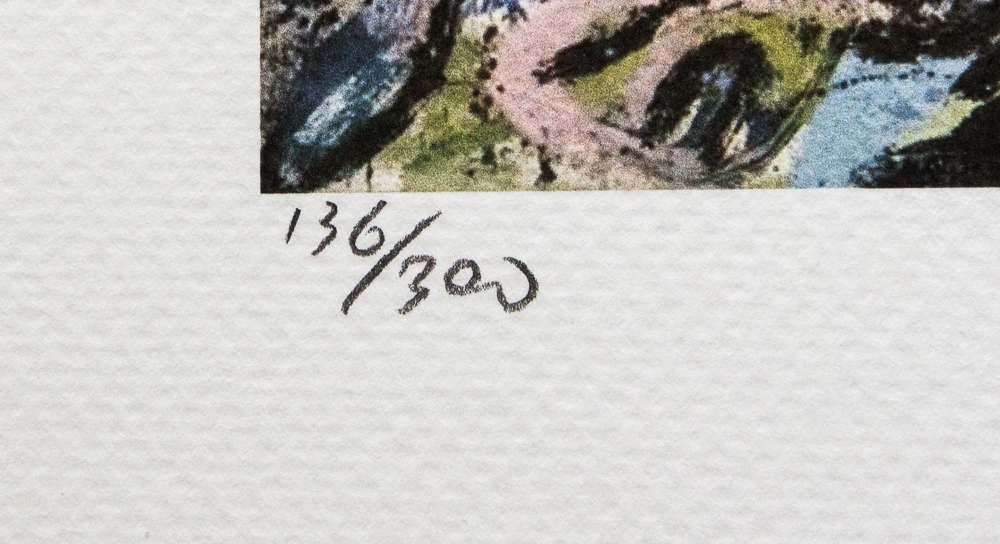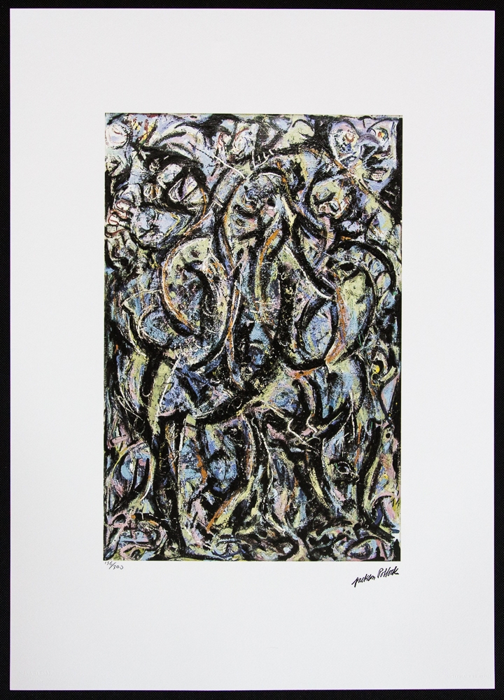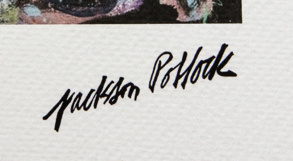 Jackson Pollock (after) "Gothic" offset lithography, sheet size 50 x 70 cm, plate signed bottom right, numbered with pencil bottom left, limited edition 136/300, with embossing stamp "SPADEM, Paris" and "ArtiGraficheRoma", heavy cotton paper, without additional documentation, sold unframed; we offer in-house shipping, if the buyer win multiple items, we will combine shipping