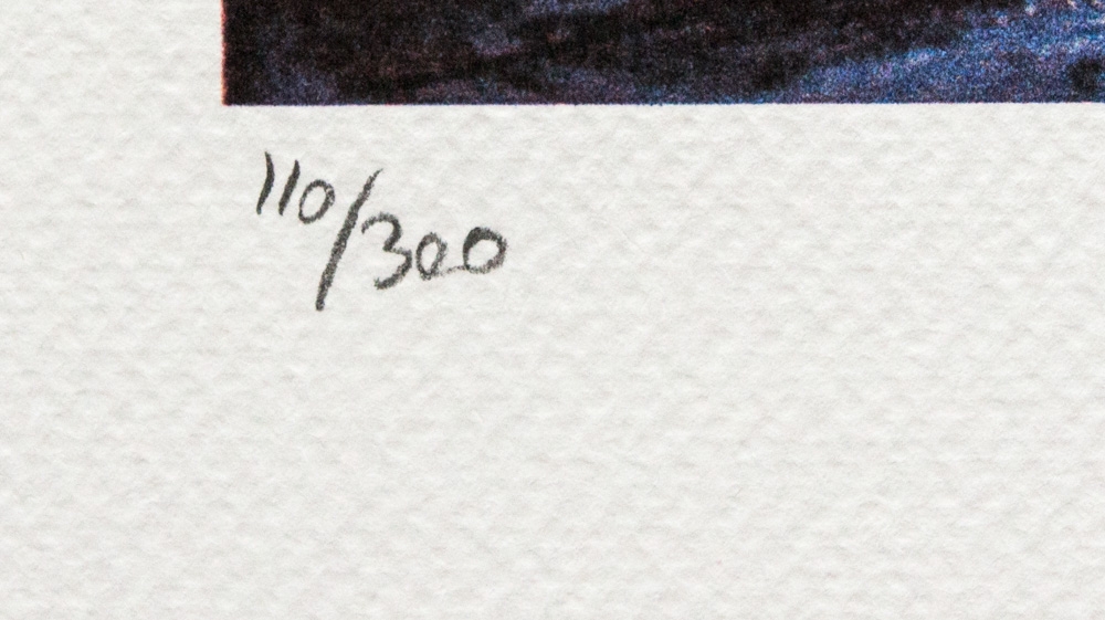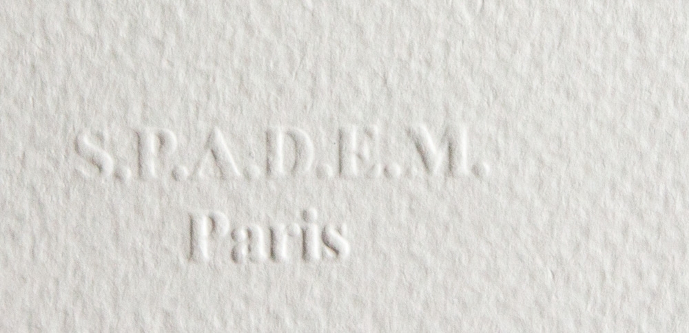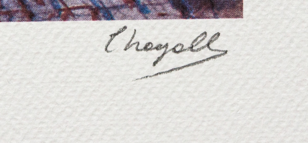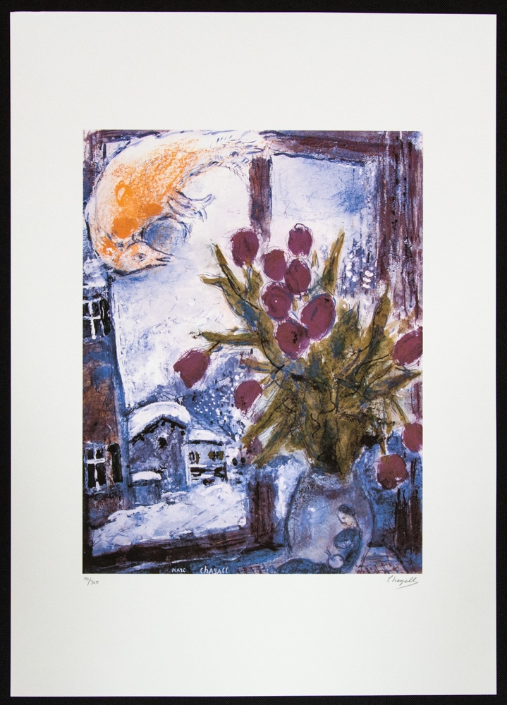Marc Chagall (after) "Bouquet of Flowers" offset lithograph, signed bottom right, numbered with pencil bottom left, limited edition 110/300, bottom left embossing stamp "SPADEM Paris" heavy cotton paper, sheet size 50 x 70 cm, without additional documentation, sold unframed; we offer in-house shipping, if the buyer win multiple items, we will combine shipping