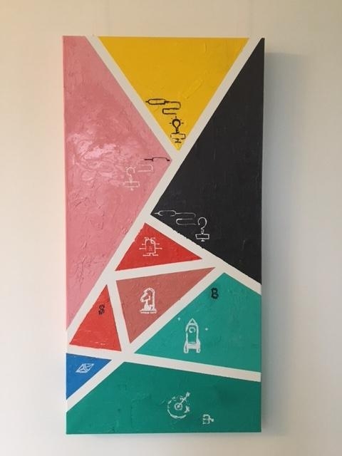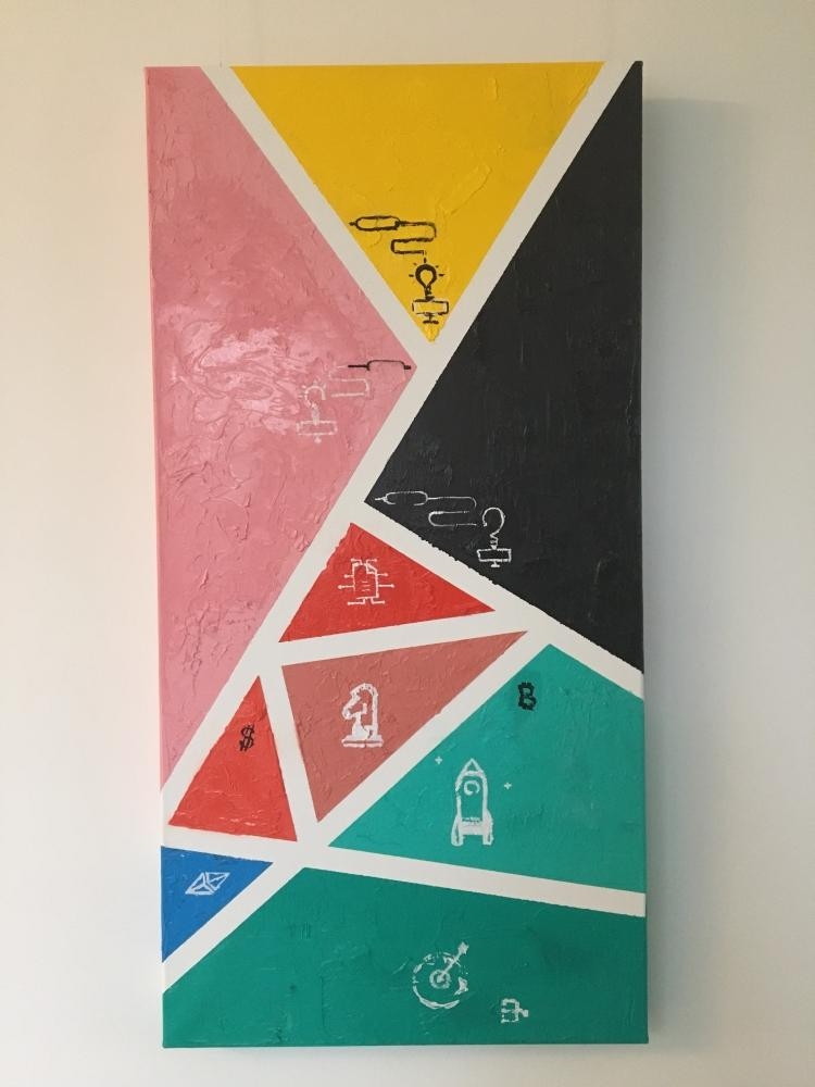 "Business Plan" is Puzzle Artwoek to guess how many triangles are there. with the start up planning signs out of it:  idea 💡;  connections 🧑🏻‍🏫🧑🏻‍🏫🧑🏻‍🏫;  planning 📄; Strategy ♟; Finances 💲; Realization 🚀 ; Success 🌀↙️ wooden frame excellent conditions Can be pick up from Netherlands by buyer artwork comes with certificate and invoice