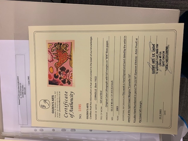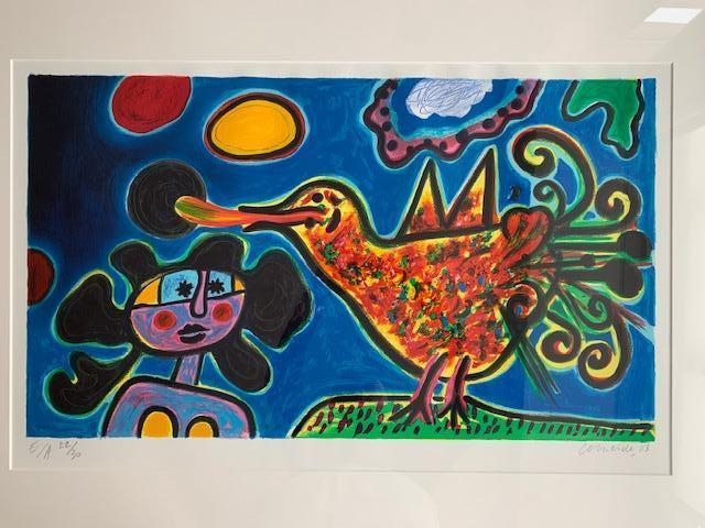 Silkscreen by Guillaume Corneille signed and numbered in pencil in a very limited edition of EA 30 pieces. The work is in perfect condition. It is framed with passe partout and yellow/ocher wooden frame (same color as the sun in the work).