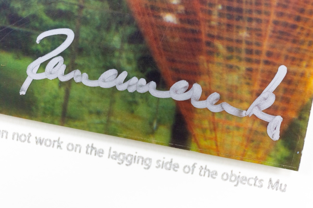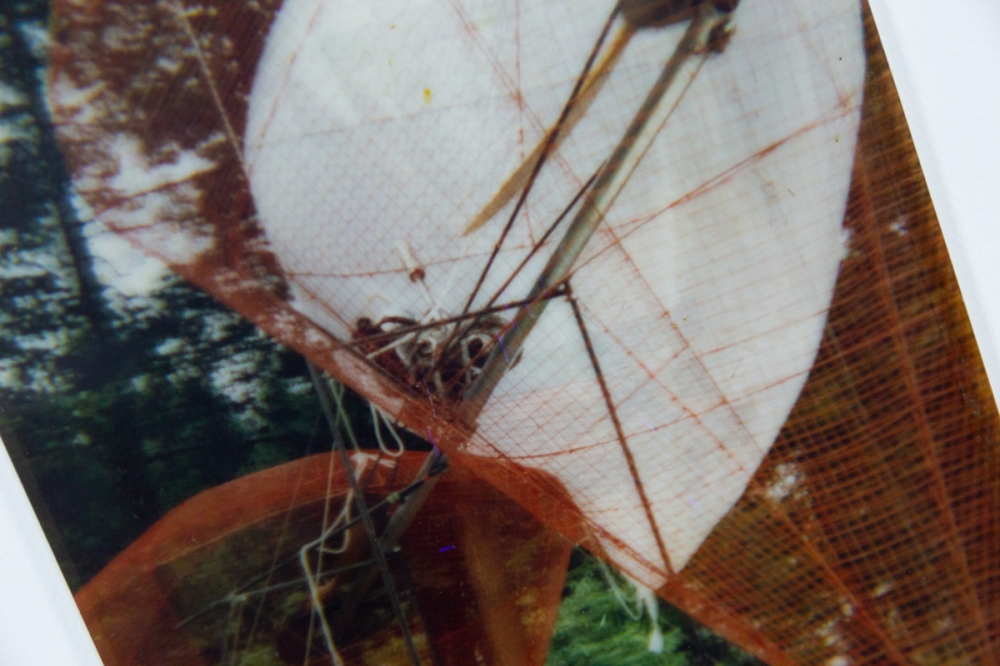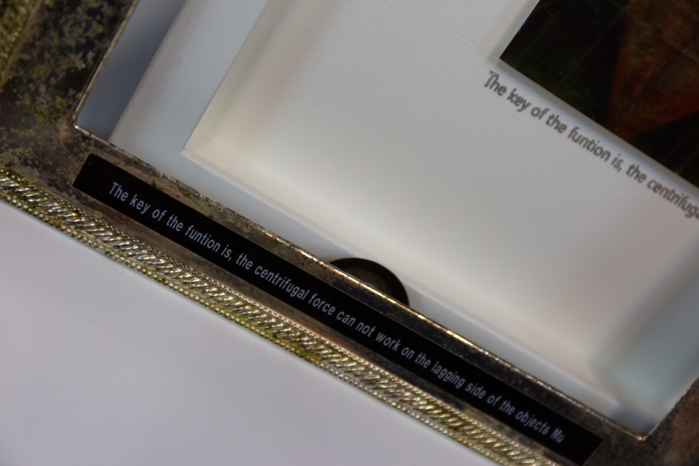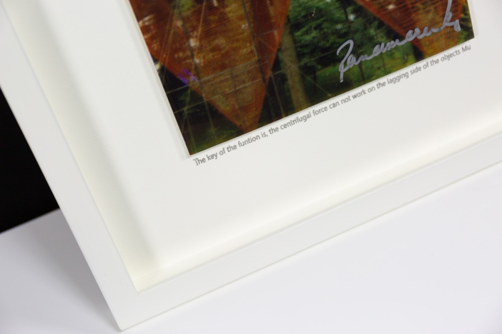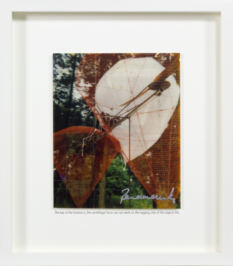 Unieke '3D' foto van Bernoulli, met de hand gesigneerd door Panamarenko en bijgestaan door de quote: "The key of the funtion is, the centrifugal force can not work on the lagging side of the objects Mu".
