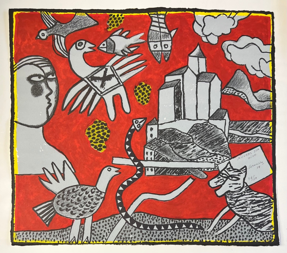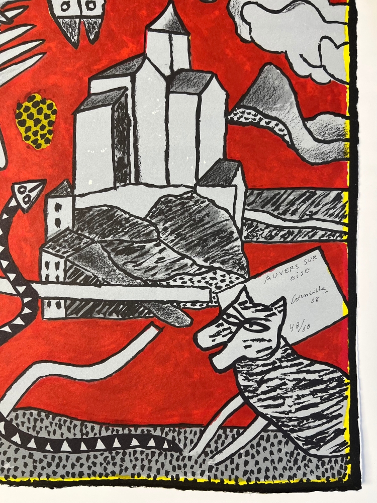 A tribute to the happiness of living in the countryside! One of the last great works of the painter installed in Auvers-Sur-Oise, the village of Van-Gogh. The snake recalls the artist's Cobra period. Beautiful lithograph on thick wove paper. Signed and dated by the hand of the artist. Numbered 48/60 - Atelier Corneille stamp on the back Dimensions: 47.5 x 54cm Bright red work with the famous church painted by Van-Gogh, and some elements of the surrounding countryside (near Paris). Very good state. Secure shipment by UPS