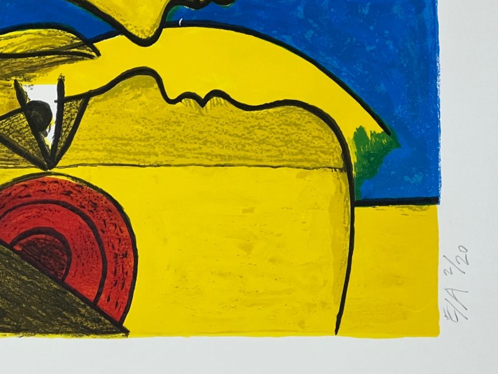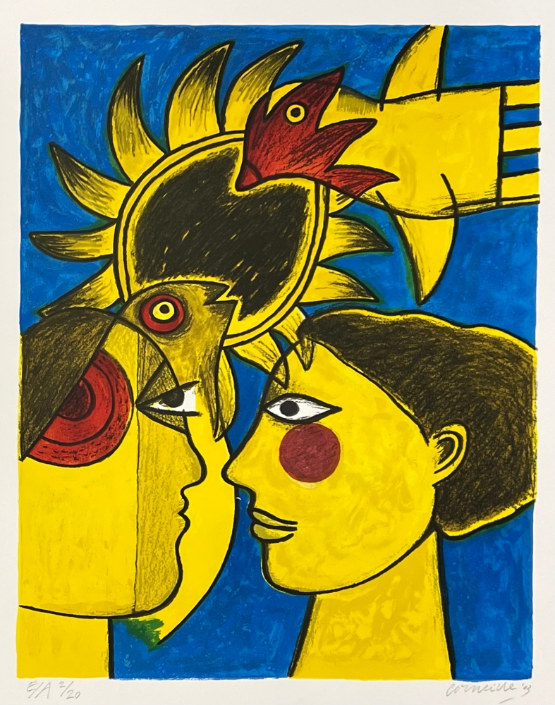Original lithograph by the painter Guillaume Corneille (1922-2010), born in Liège to Dutch parents and founding member of the Cobra group with Karel Appel, Asger Jorn, Constant, Dotremont and later Alechinsky and Jacques Doucet "Idyll" Signed and dated in graphite by the hand of the artist Numbered E/A 2/20 - Atelier Corneille stamp on the back. Total dimensions: 65 x 50 cm Perfect condition - Secure shipping with UPS Grand Master of color, in the wake of Gauguin or Matisse, Guillaume Corneille creates a jovial and colorful world that celebrates harmony with nature. The lithographic impression is of such quality that it gives the impression of having the brushstrokes in front of you. In the 1990s, Corneille set up his studio in the middle of his garden facing the wheat fields painted by Van Gogh. We find here the starry stars and the yellow Van Gogh which makes this amorous encounter a solar encounter. Cobra exhibition with the largest American collection of Corneille in Miami in spring and summer 2023. The Cobra retrospective in the Cobra Museum in Amstelveen has just ended on 15 January. Release of a Cobra / Corneille stamp by Bpost in 2023 Corneille jewellery exhibited at the Boghossian Foundation until 14 May 2023 (Ornamentum, Collection Diane Venet)