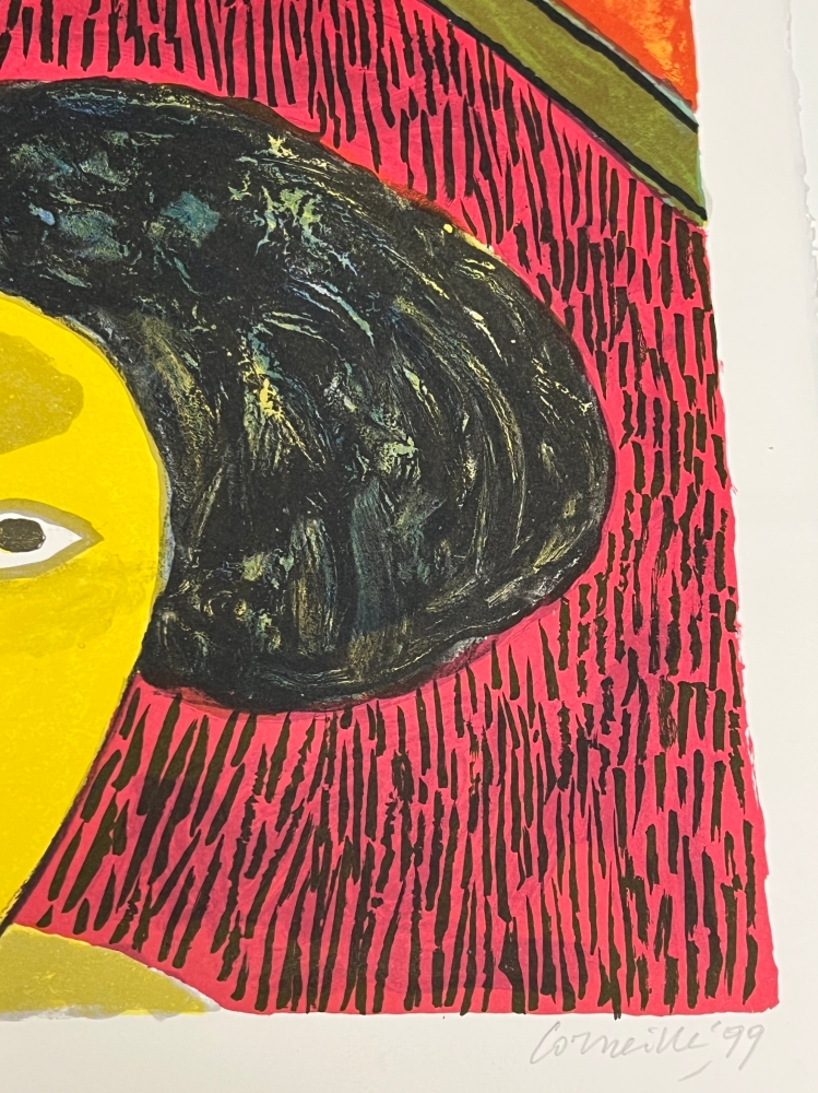 In the 1990s, Guillaume Corneille set up his studio in the middle of his garden facing the wheat fields painted by Van Gogh. Superb large format original lithograph by the painter Guillaume Corneille, born in Liège to Dutch parents, founding member of the Cobra movement, with Karel Appel, Asger Jorn, Constant, Dotremont and Joseph Noiret. Dimensions: 76 x 56cm. The quality of the lithography is such that it gives the impression of having the brushstrokes in front of you. Signed and dated in pencil by the artist Numbered 64/75 "The sunflower" With this lithograph, Corneille pays homage to Vincent van Gogh's sunflowers. So many flowers, a thousand and a thousand suns, torrent of sunflowers, huge solar honey pour between the breasts of the green hills. Yellow, Yellow, Van Gogh Yellow Color that only he knew so magnify. » CROW In a perfect state Secure shipping with UPS