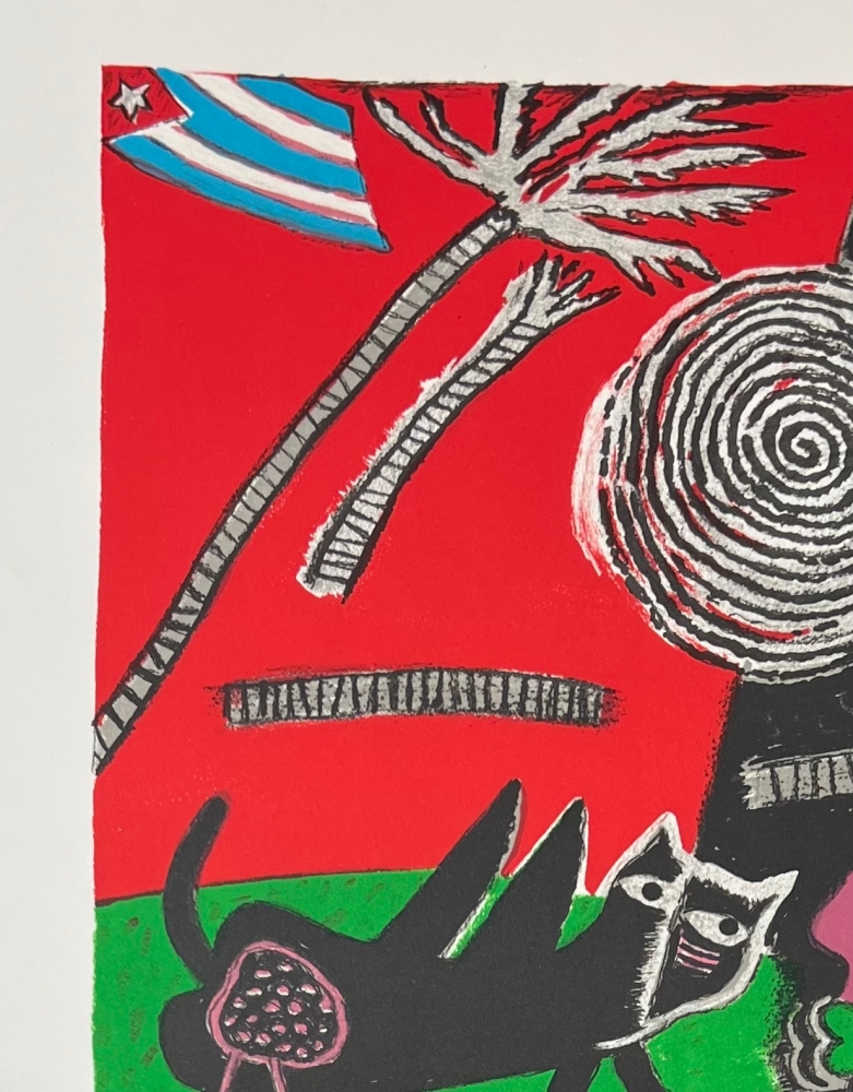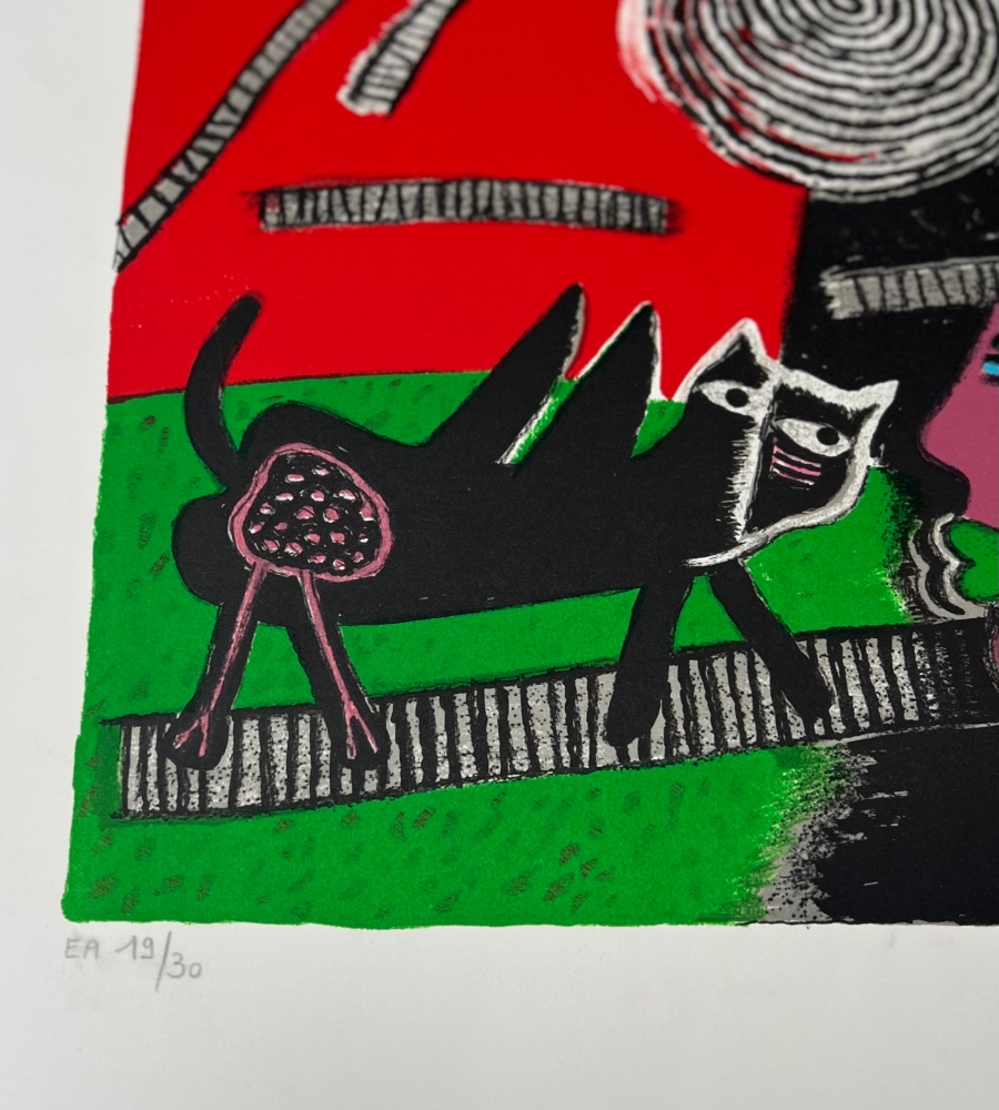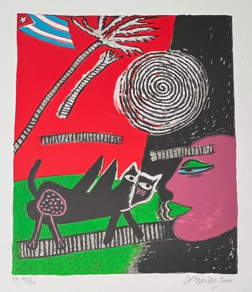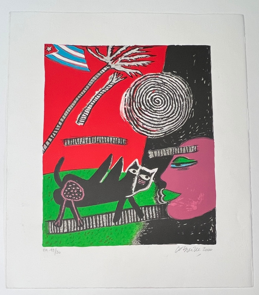 Bell work with the Cuban flag, inviting to travel. Cobra exhibition with the largest American collection of Corneille in Miami in spring and summer 2023. Retrospective of Corneille's work in the Cobra Museum in Amstelveen, which ended on 15 January. Release of a Cobra / Cornelius stamp by Bpost in 2023 Corneille's jewellery on display at the Boghossian Foundation until 14 May 2023 (Ornamentum, Collection Diane Venet) Original lithograph by the painter Guillaume Corneille (1922-2010), born in Liège of Dutch parents and founding member of the Cobra group with Karel Appel, Asger Jorn, Constant, Dotremont and later Alechinsky and Jacques Doucet Signed and dated in pencil by the artist Numbered E/A 19/30 Total dimensions : 57 x 49 cm - Very good condition with some fogging on the paper - Secure shipping with UPS Identified as an important figure in the renewal of abstraction in Northern Europe, Cornelius gradually moved from 1967 onwards towards a rich and colourful New Figuration which coordinated with the Pop Art taste of the 1960s and 1970s, and exhibited alongside Andy Warhol, Arman, César, etc. Secure shipping with UPS