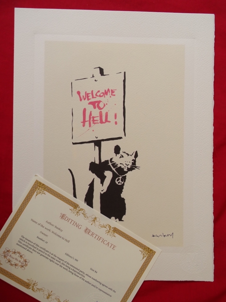 Banksy. Limited edition print reproduction, 38x28cm, Certificate of Authenticity by Certified Arts Edition Impression Ars Longa Vita Brevis Banksy is a pseudonymous England-based street artist, political activist and film director whose real name and identity remain unconfirmed and the subject of speculation. Active since the 1990s, his satirical street art and subversive epigrams combine dark humour with graffiti executed in a distinctive stenciling technique. His works of political and social commentary have appeared on streets, walls and bridges throughout the world. Banksy's work grew out of the Bristol underground scene, which involved collaborations between artists and musicians.Banksy says that he was inspired by 3D, a graffiti artist and founding member of the musical group Massive Attack. Banksy displays his art on publicly visible surfaces such as walls and self-built physical prop pieces. Banksy no longer sells photographs or reproductions of his street graffiti, but his public "installations" are regularly resold, often even by removing the wall they were painted on.Much of his work can be classified as temporary art. A small number of Banksy's works are officially, non-publicly, sold through an agency created by Banksy named Pest Control. Banksy's documentary film Exit Through the Gift Shop (2010) made its debut at the 2010 Sundance Film Festival.In January 2011, he was nominated for the Academy Award for Best Documentary Feature for the film. In 2014, he was awarded Person of the Year at the 2014 Webby Awards.