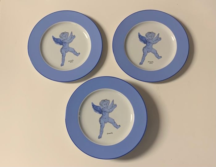 Elegant Limoges porcelain service by the artist Guillaume Corneille (1922-2010), in tribute to the great Flemish painter. 2002 Set of 3 plates with a circumference of 26.3 cm and a height of 2 cm. Serigraphies on porcelain signed in the plate. Plates for main courses or decorative plates. This work is also a tribute to the city of Antwerp which has regularly exhibited the artist Cobra through dynamic galleries. Guillaume Corneille is an erudite painter and art historian, like Alechinsky or David Hockney, who lived in Italy for a long time. How can one not see in this Happy Angel the dance of an Italian putto? Guillaume Corneille, born in Liège of Dutch parents, is one of the founding members of the Cobra group (contraction of Copenhagen, Brussels, Amsterdam) which includes Karel Appel, Christian Dotremont, Asger Jorn, Constant and Alechinsky.