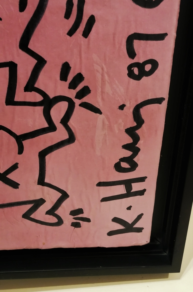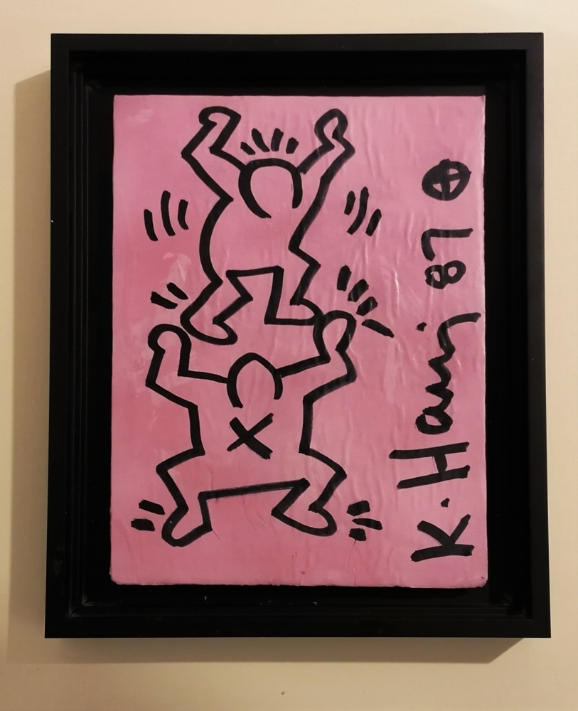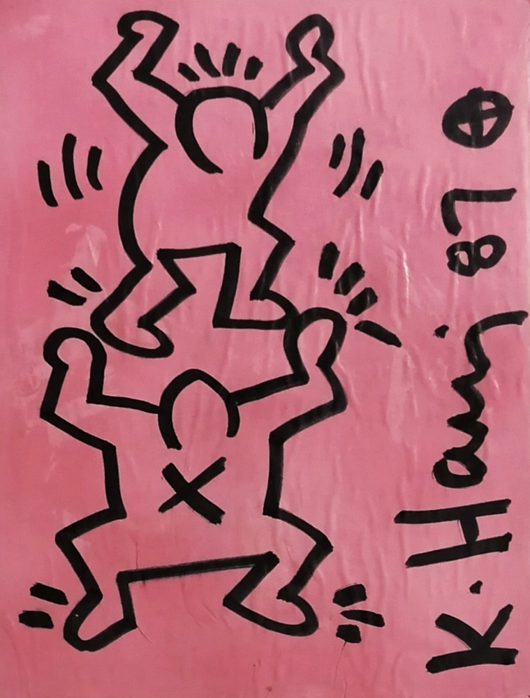 Keith Haring (1958- 1990) Felt pen drawing on pink colored paper of two figures. Work is signed on the right and dated 1987. Dimensions: 28 x 21 cm Pasted on wood fiber board, in vintage condition. In a black frame, 33 x 27 cm