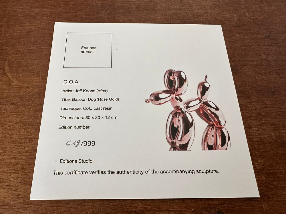Resin sculpture after Jeff Koons, published by Éditions Studio. Edition limited to 999 pieces, of which this number is 619. The sculpture comes with the original packaging and is accompanied by the original certificate. Sculpture is in good to excellent condition.