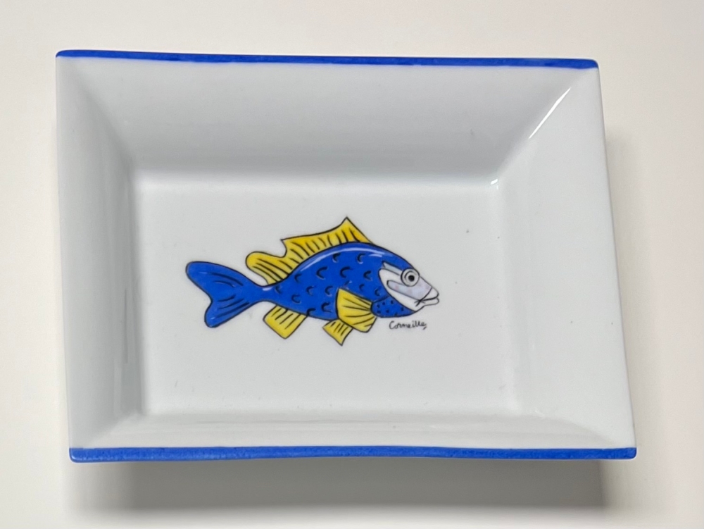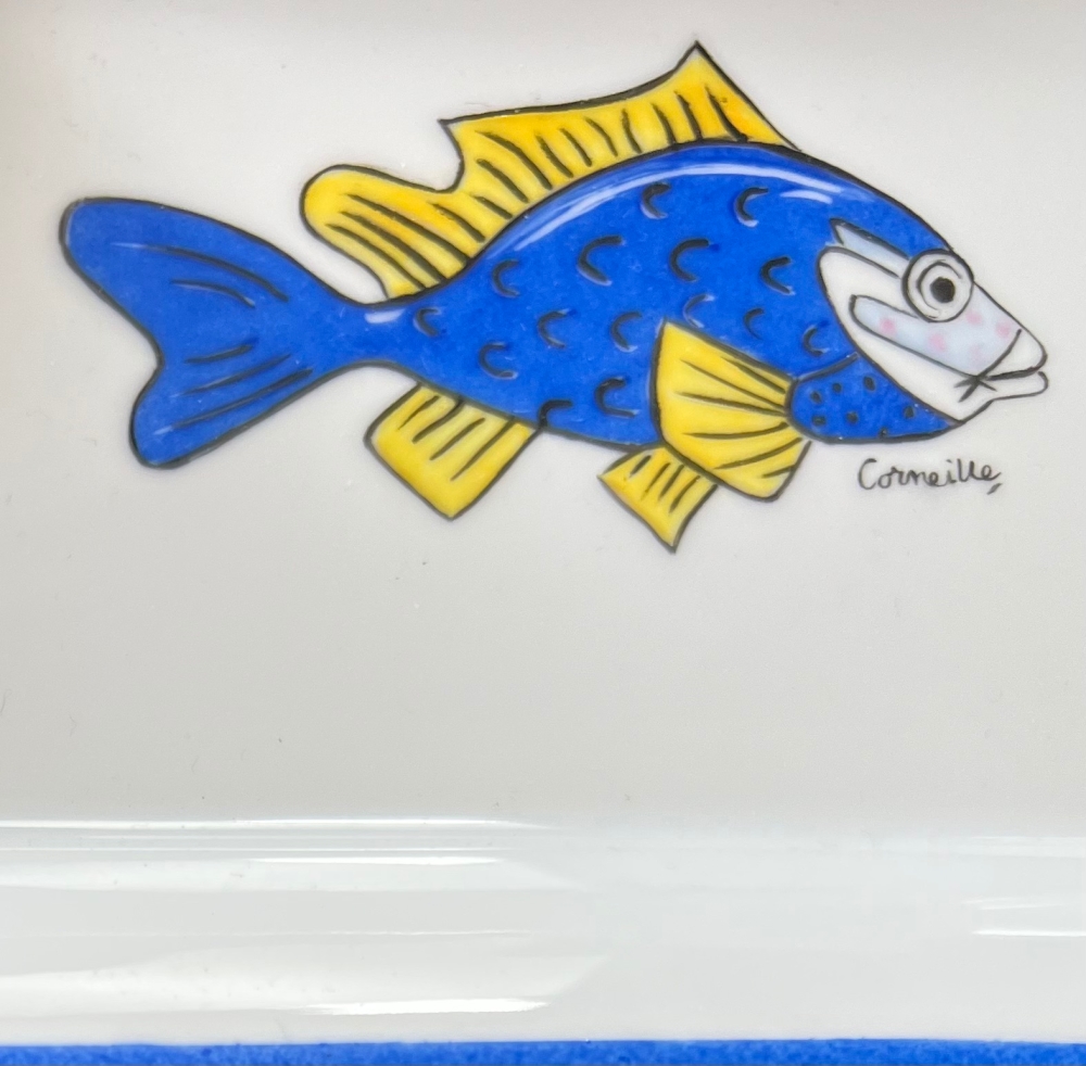 Superb "Poisson" small plate hand-painted by Corneille's ceramics workshop (1922-2010) dissolved at his death in 2010. With the mention on the back: Exclusive for Schana B Gallery - Dimensions: 20,5 x 16 x 3,5 cm - Hand wash Limoges porcelain with multiple uses: presentation dish or decorative dish Guillaume Corneille was one of the founding members of the Cobra group with Karel Appel, Asger Jorn, Christian Dotremont, Constant, Jacques Doucet, Simon Vinkenoog and Alechinsky. Secure delivery by UPS Cobra exhibition with the largest American collection of Corneille in Miami in spring and summer 2023. The Cobra retrospective in the Cobra Museum in Amstelveen has just ended on 15 January. Release of a Cobra / Corneille stamp by Bpost in 2023 Corneille jewellery exhibited at the Boghossian Foundation until 14 May 2023 (Ornamentum, Diane Venet Collection)