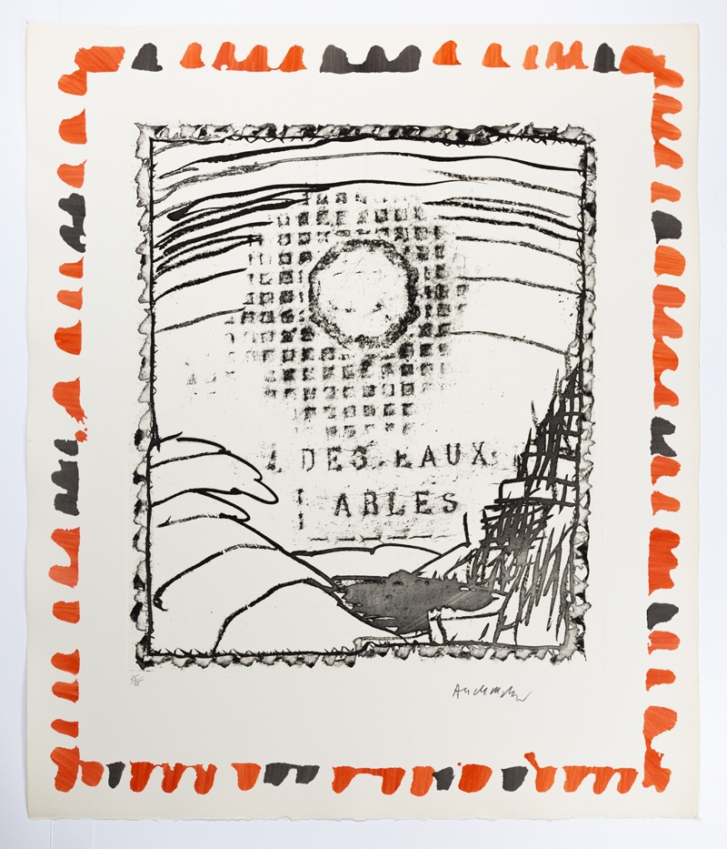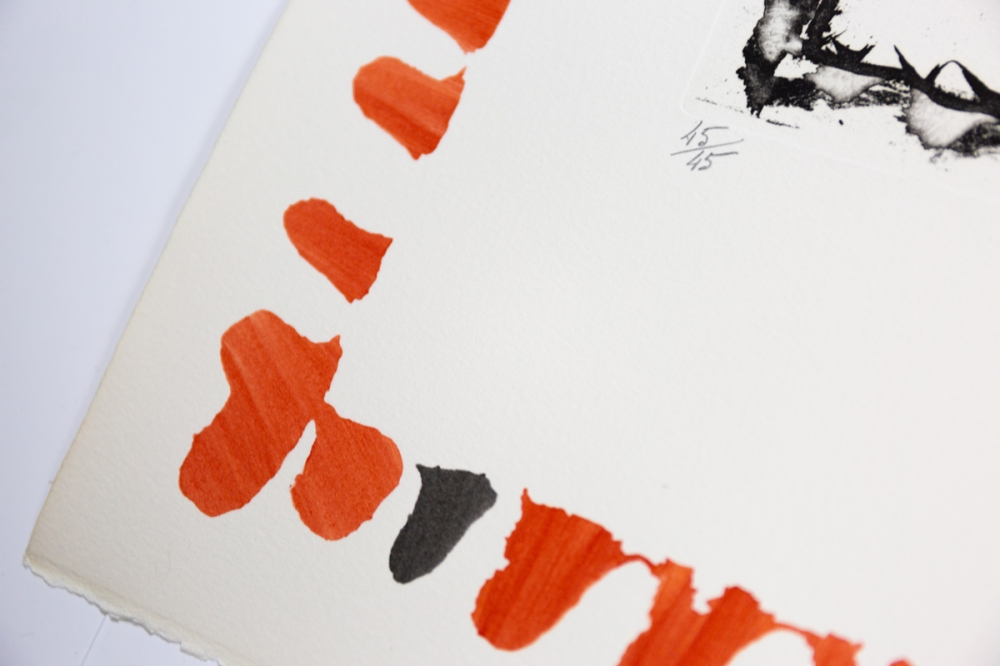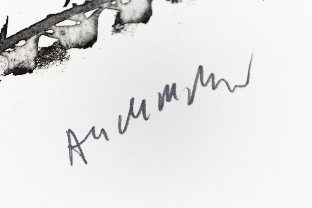 Originele en unieke ets met pochoir van waterverf errond, getekend en genummerd 45/45. Hier is de introductie van riool- en putdeksels merkbaar in zijn werk. Alechinsky maakte een 'doordruk' van een putdeksel (zoals we als kind een muntstuk op papier doordrukten met een potlood), waarrond hij verder speelt en improviseert in zijn grafische en originele werken. De pochoir of omkadering in waterverf maakt het werk extra interessant en hierdoor kunnen we spreken van een gemengde techniek. Pierre Alechinsky is een Belgische kunstenaar die in 1949 lid werd van de Cobra groep (CoBrA= Copenhagen Brussel Amsterdam) en hij was een belangrijke vertegenwoordiger van Cobra. Hij is trouwens nog de enige in leven zijnde Cobra kunstenaar. Zijn werk bevindt zich in de collectie van de grote musea voor moderne kunst in de hele wereld.