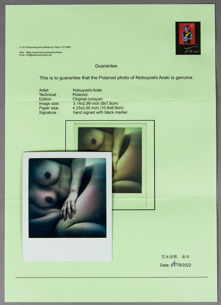 Nobuyoshi Araki Polaroid, paper size 10.8 x 8.9 cm, image size 8 x 7.6 cm, signed with black marker on the back, with certificate; we offer in-house shipping, if the buyer win multiple items, we will combine shipping