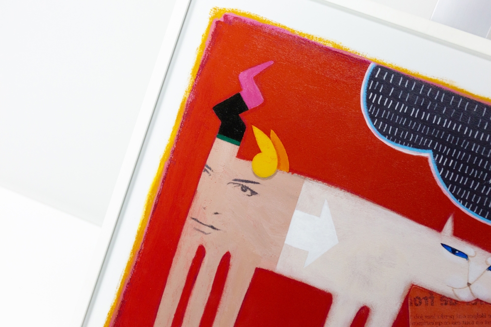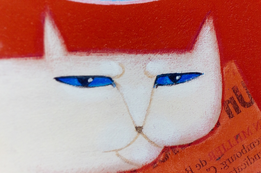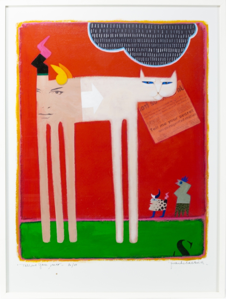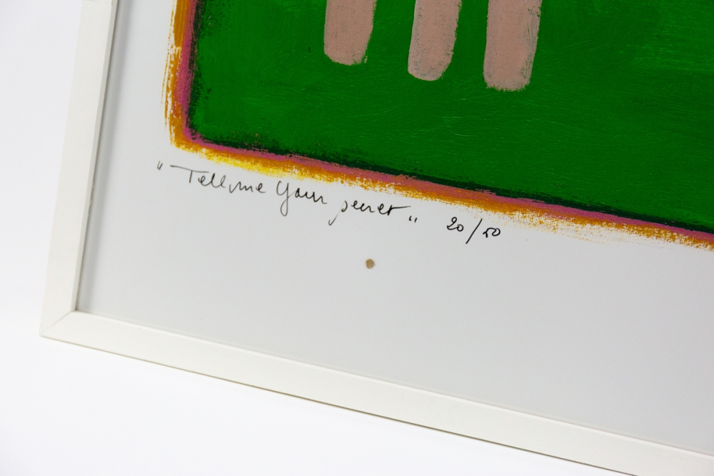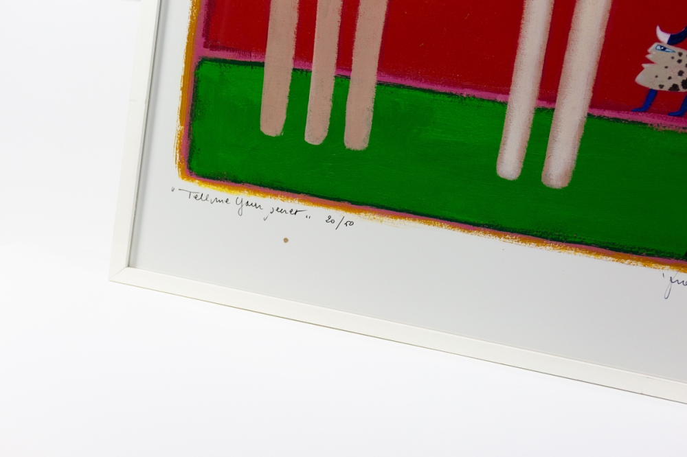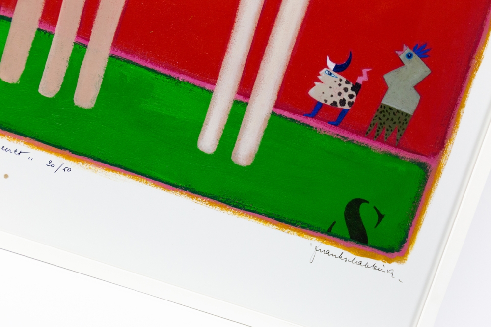 ingekaderd in een sobere, houten witte kader met uv-werend glas. In goede tot uitstekende staat. Er zit wel een klein stukje karton/hout, wellicht van de kader zichtbaar linksonderaan (zie foto 2)