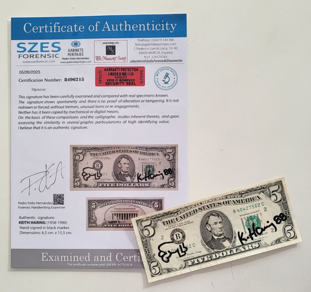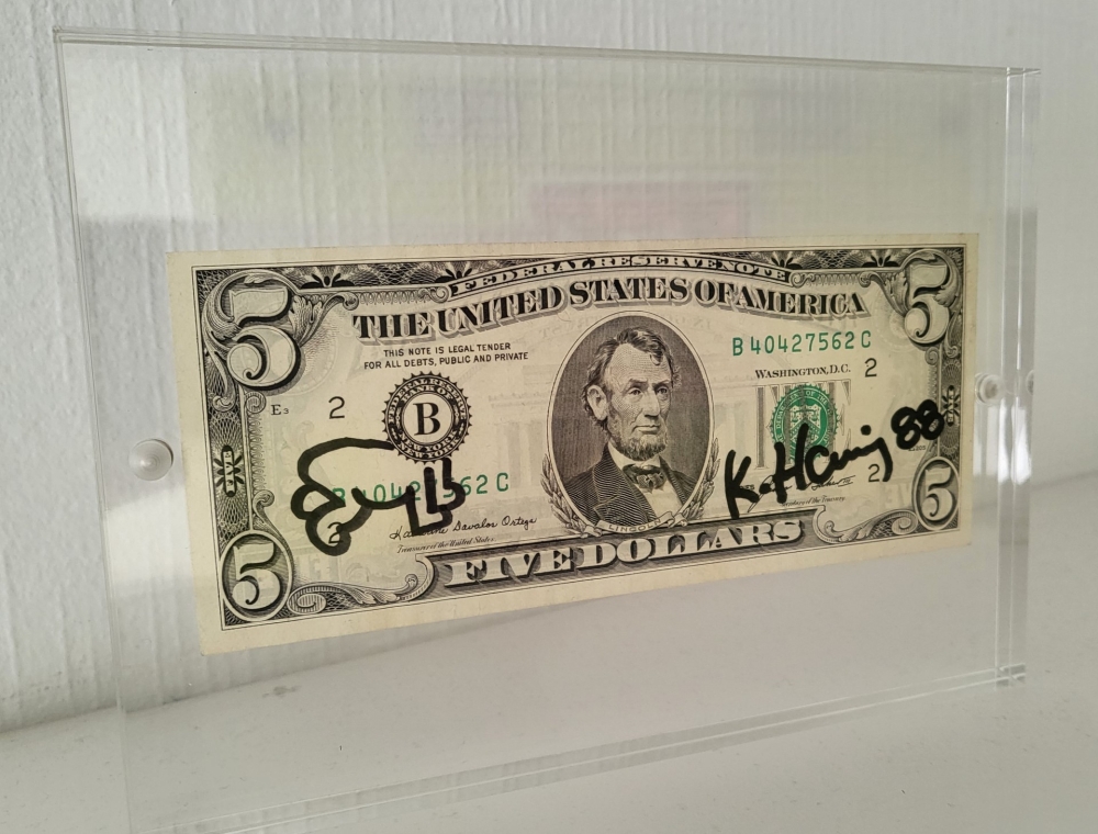 Uniek 5$ biljet uit serie 1988, gesigneerd en gedateerd door Keith Haring met tekening van de "Radiant Baby". In zeer goede staat. Met COA (Certificaat of Authenticity) van SZES Forensics. Wordt ingelijst verzonden in acryllijst van 13 op 18 op 2 cm.
