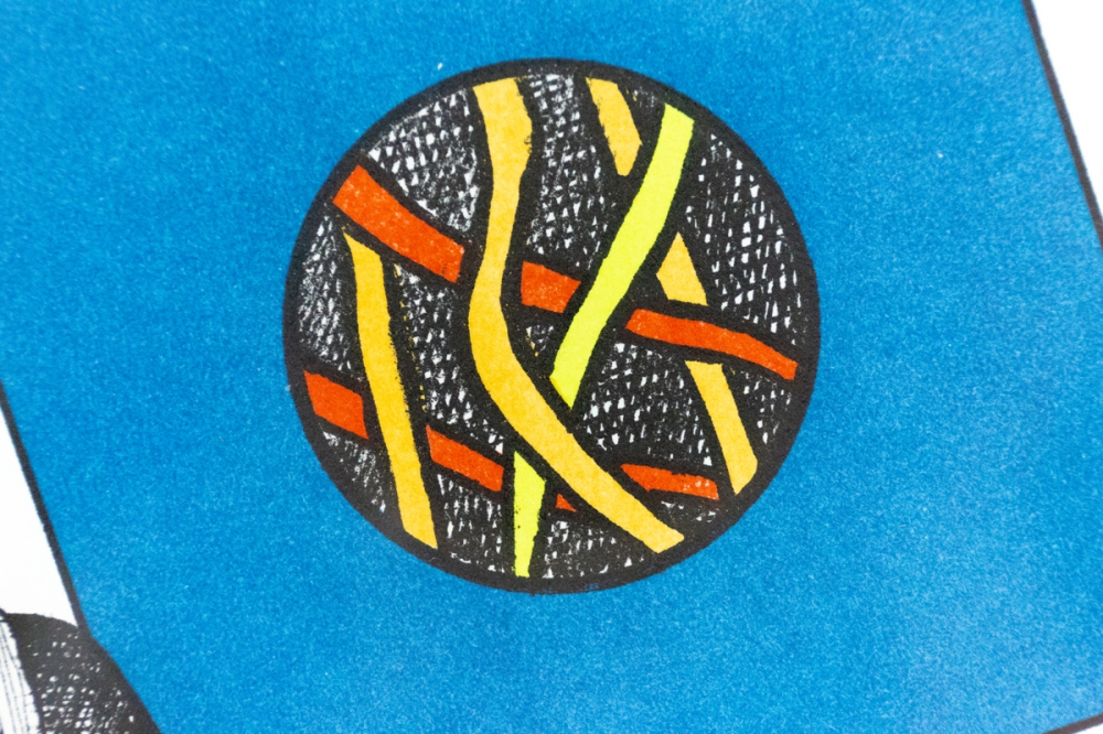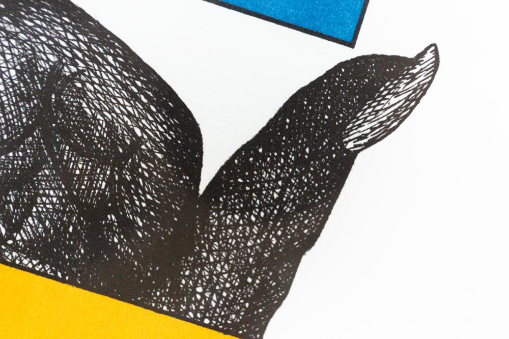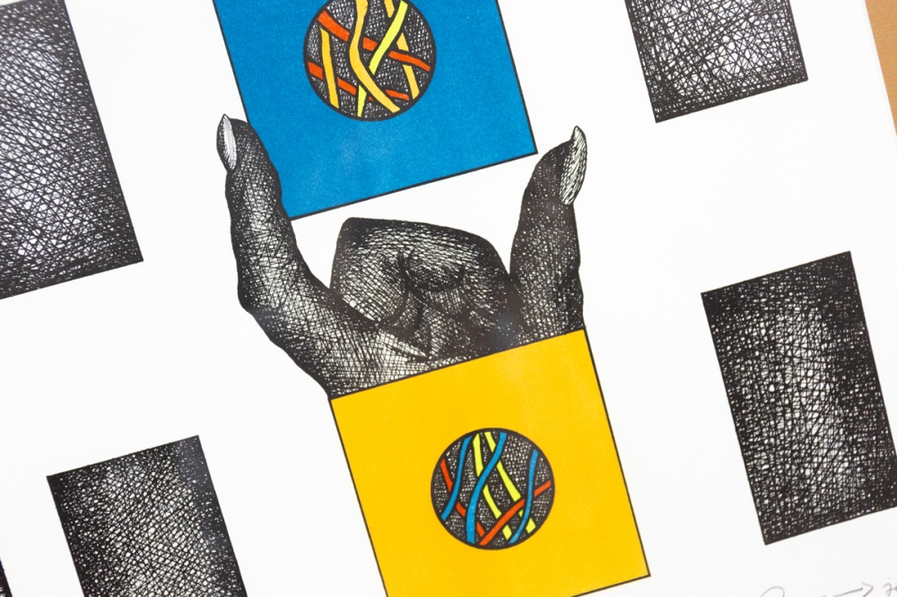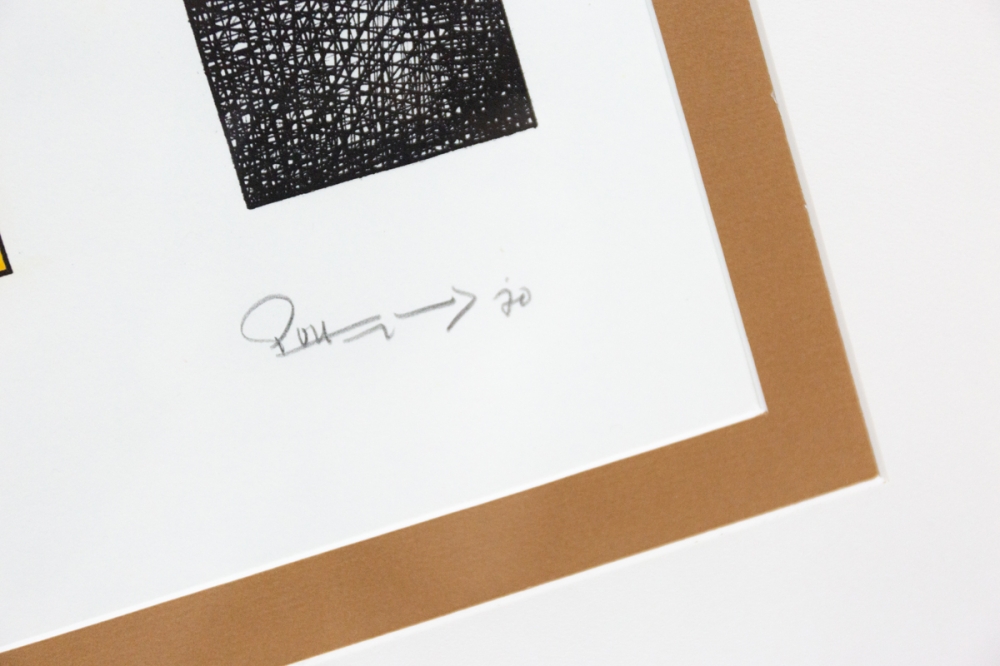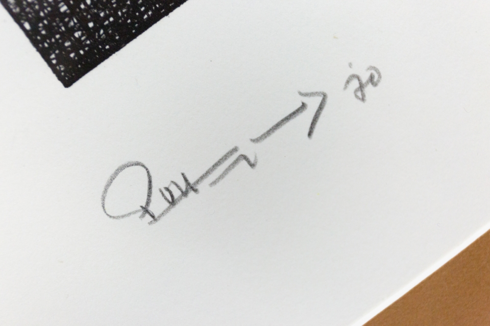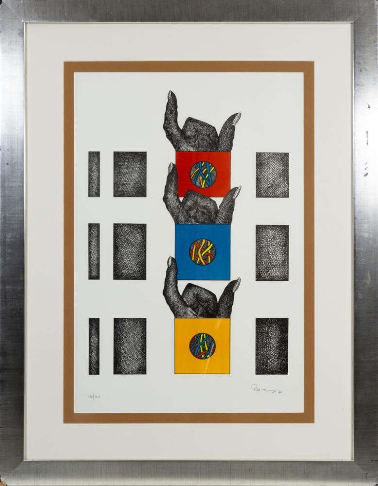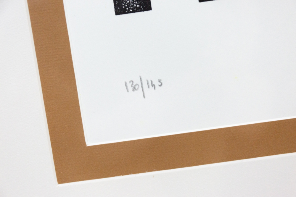 Zeefdruk in goede tot uitstekende staat. Kader in iets mindere staat.