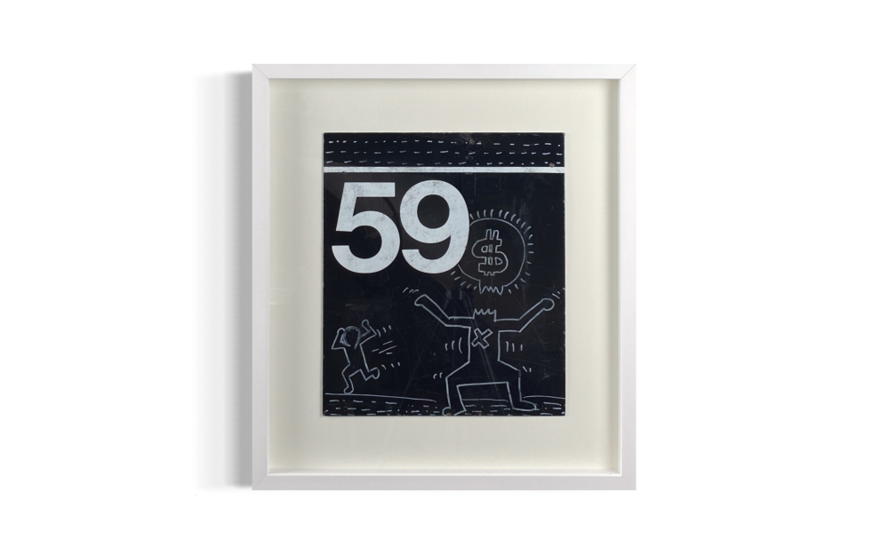 Original drawing by American pop art artist Keith Haring on Subway Sign from the New York subway ca. 1982. Professionally framed in a white baking frame. 52x48 cm Insured shipping as well as collection possible.