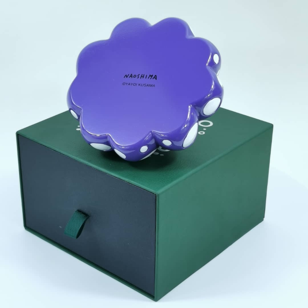 Yayoi Kusama is a famous Japanese artist. Among his most famous works are his Polka Dot Pumpkins. Artist: Yayoi Kusama (after) Title: Naoshima Pumpkin (purple& White) Green box Dimensions: 14 x 14 (dia) cm Resin