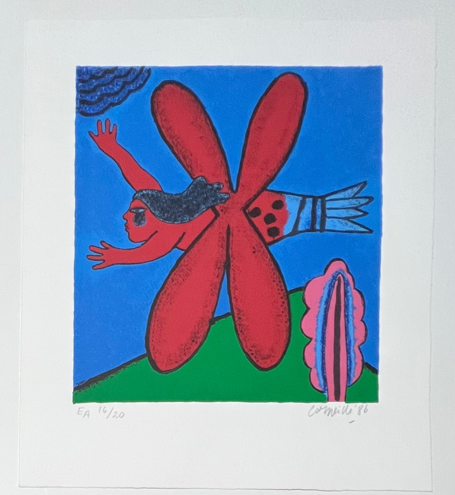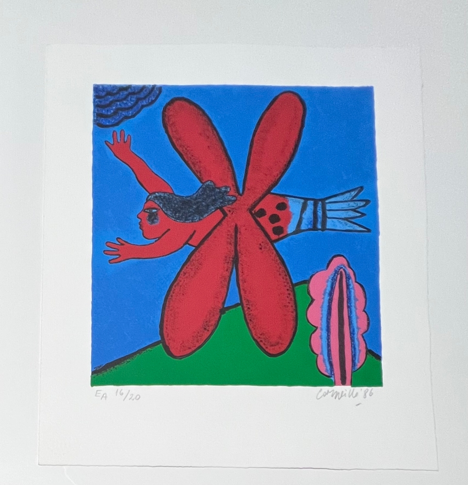 Warning: unusual work! The bird-insect or fish-insect appeared very early in the painter's work in 1948 with the creation of the Experimentele Groep in Holland. Exhibition of 75 years of Cobra from June 1st at the Cobra Museum in Amstelveen. Opening of the Cobra depot in Antwerp in June 2023 Release of a Cobra / Corneille stamp at Bpost in 2023 Picasso had his favorite animals: the bull, his dog Lump or his goat. Guillaume Corneille had an incalculable number of animals in his bestiary: the greyhound, cats, fish, elephants and all kinds of birds, in very colorful works in the wake of Matisse, Gauguin and Van Gogh. Original screenprint by the painter Guillaume Corneille (1922-2010), born in Liège of Dutch parents and founding member of the Cobra group with Karel Appel, Asger Jorn, Constant, Dotremont and later Alechinsky and Jacques Doucet. Signed and dated in pencil by the artist. Artist's copy E/A 16/20 Total dimensions: 46 x 40 cm - Perfect condition - Secure shipping with UPS Identified as an important figure in the renewal of abstraction in Northern Europe, Corneille gradually moved from 1967 towards a rich and colorful New Figuration that coordinated with the Pop Art taste of the 1960s and 1970s, and exhibited alongside Andy Warhol, Arman, César, etc.