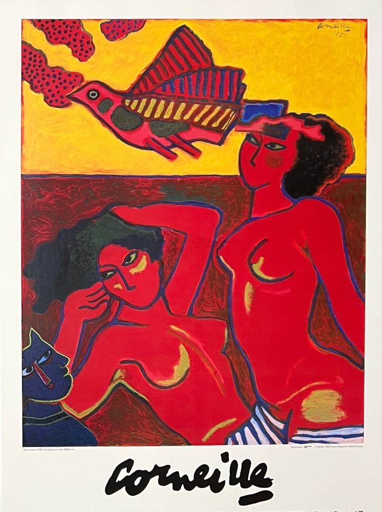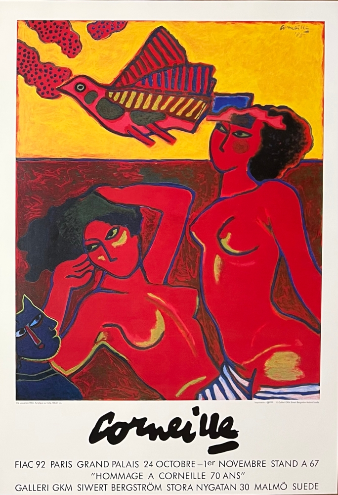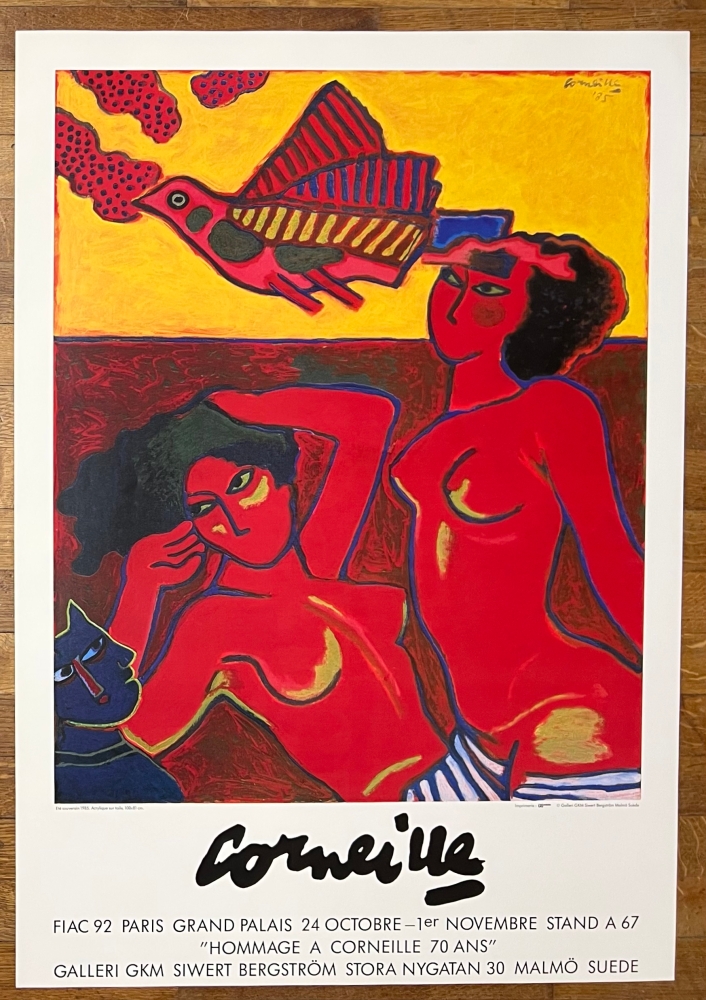 Large poster produced by the painter in 1992 with the GKM gallery. Exhibition to mark 75 years of Cobra from June 1 at the Cobra Museum in Amstelveen. Opening of Cobra depot in Antwerp. Cobra exhibition with the largest American Cornelius collection in Miami in spring and summer 2023. Release of a Cobra / Corneille stamp by Bpost in 2023. Large, unusual poster by the painter Guillaume Corneille, born in Liège of Dutch parents and a founding member of the COBRA group with Karel Appel, Asger Jorn, Christian Dotremont, Constant, Hugo Claus, Lucebert, Alechinsky and Jacques Doucet. Poster dimensions: 100 x 70 cm. Very good condition with Atelier Corneille stamp on back. Corneille Fiac 1992. Grand Palais Gallery GKM MALMO SUEDE Secure shipment by UPS