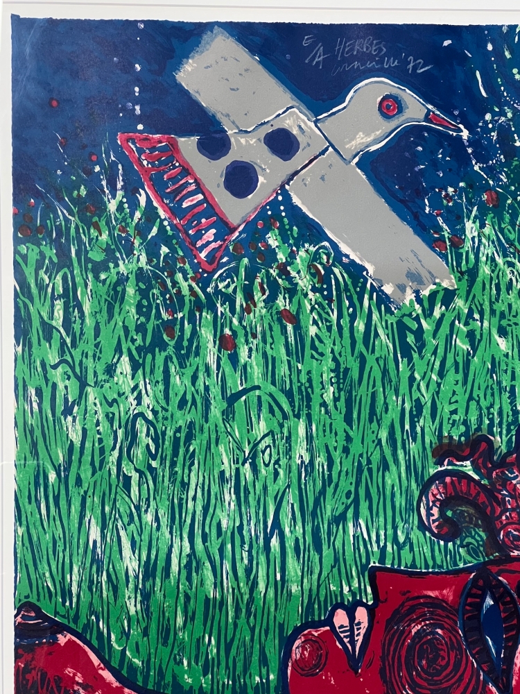 Eye of Cobra exhibition in Miami with the largest American collection of Corneille in spring and summer 2023. Corneille retrospective which has just ended this January 15 at the Cobra Museum in Amstelveen. Release of a Cobra / Corneille stamp at Bpost in 2023 Corneille jewels exposed at the Boghossian Foundation until May 14, 2023 (Ornamentum, Collection Diane Venet) Beautiful original framed lithograph by the painter Guillaume Corneille (1922-2010), born in Liège from Dutch parents, founding member of the Cobra movement, with Karel Appel, Constant, Asger Jorn, Dotremont, Joseph Noiret or Lucebert or Alechinsky. Framed in the painter's lifetime. Solid wood varnished and painted in the state (with some shocks and traces of wear) with Atelier Corneille stamp on the back. Total dimensions with frame : 93 x 78 cm - 1972- Dimensions of the work : 65 x 50 cm. Warning : this is our ONLY copy! Signed and dated at the top by the artist - Artist's copy E/A Commercial edition at 100 copies + Edition of 10 copies reserved for the painter. This is one of the 10 copies. Good condition. The paper of the lithograph has curled under the glass (see pictures). Hand delivery welcome - Secure shipping in a BIG BOX with insurance by UPS Guillaume Corneille, grand master of colors in the footsteps of Gauguin and Matisse, creates a jovial world full of exoticism. Exhibition of 75 years of Cobra since June 1st at the Cobra Museum in Amstelveen. Opening of the Cobra depot in Antwerp. Release of a Cobra / Corneille stamp at Bpost in 2023