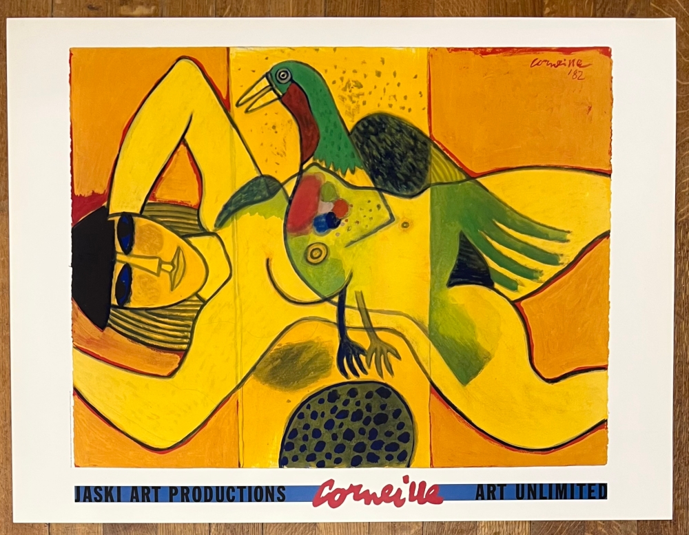Exhibition of 75 Years of Cobra from June 1st at the Cobra Museum in Amstelveen. Atelier Corneille stamp on the back. Artist's copy. Superb poster by Guillaume Corneille (1922-2010), painter born in Liège to Dutch parents, founding member of the COBRA group, with Constant, Karel Appel, Dotremont, Joseph Noiret and Asger Jorn, reproducing the Nu Jaune of 1982. This poster has often been shown on television and reproduced in books. A summer poster of a female nude on the beach with a bird. Grand Master of color, in the wake of Gauguin and Matisse, Guillaume Corneille devoted a significant part of his creation to posters, and after marking post-war abstraction, embarked on a free and jovial figuration coordinated with the Pop-Art movement. Dimensions of this poster: 60 x 80 cm - Offset poster - Galerie Jaski - Printed in Holland Very good condition for a poster almost 40 years old.