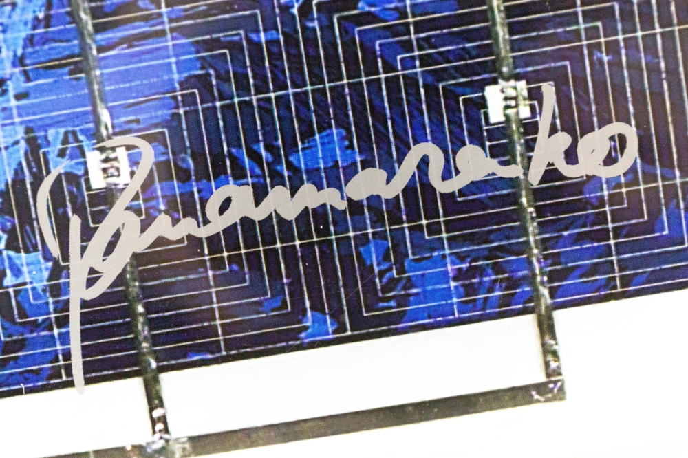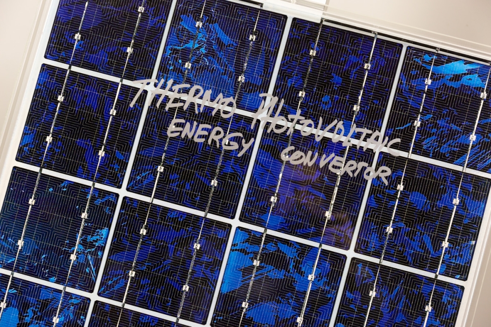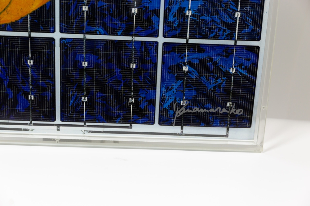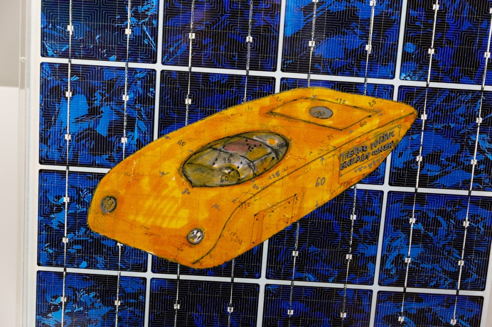 Een aantrekkelijke en iconische Thermo Photovoltaic map/folder, met gedrukte handtekening, professioneel ingekaderd in een plexibox. Deze map is de originele, zeldzame verzamelfolder voor de editie van Panamarenko uit 2001, die zes offsetprints bevatte ("Energy converter", "Zonneauto", "Hitteprobleem", "Thermo Voltaic Energy Converter","Branderbek met sigleur" en "Sigleur").